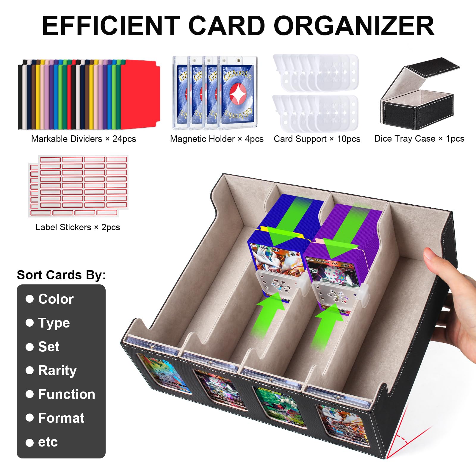 Store your valuable trading cards with our trading card storage box in confidence and style! If you are seeking for a card storage box that blend elegance practicality protection and durability our sleek card deck box will be your best choice. From business cards to collectible cards this card storage box offers a convenient and seway to keep your cards safe and easily accessible at all times. The magnetic closure allowing for easy access to your cards while ensuring that they remain securely stored when not in use. The enhanced waterproof exterior PU leather provides excellent protection against moisture and scratch. The velvet-like interior ensures that the cards remain free from scratches and creases. Our card deck box is more than just a card holder it's an essential companion for any card enthusiasts. 1. Special Design to Fit Top Loaders and Magnetic Holders Unlike other card storage boxes that do not fit top loaders and magnetic holders we raise and widen the card game-style you can use top loaders and magnetic holders with our card storage box. 2. Versatile Card Storage Box It is not only compatible with MTG TCG CCG LCG Magic sports cards Duel Masters Lorcana cards Marvel Champion collection etc. but also compatible with Ulto-pro plastic card deck box. Product Specifications: Trading Card Storage Box Outer Size: 13.8 ? 11.8 ? 4.7 inches Card game-style Size: 4.3 ? 3.0 inches Material: enhanced PU Leather velvet-like interior Capacity: Holder up to 3200+ sleeveless cards 1800+ single-sleeved cards or 1500+ double-sleeved cards. Available Colors: Black/Red Black/Blue Black/Purple Black/Grey White/Red Blue/White Turquoise/White Package Includes: 1 ? Trading Card Storage Box 1 ? Dice Tray Case 24 ? dividers 10 ? card supporters 4 ? magnetic holders 2 ? label paper