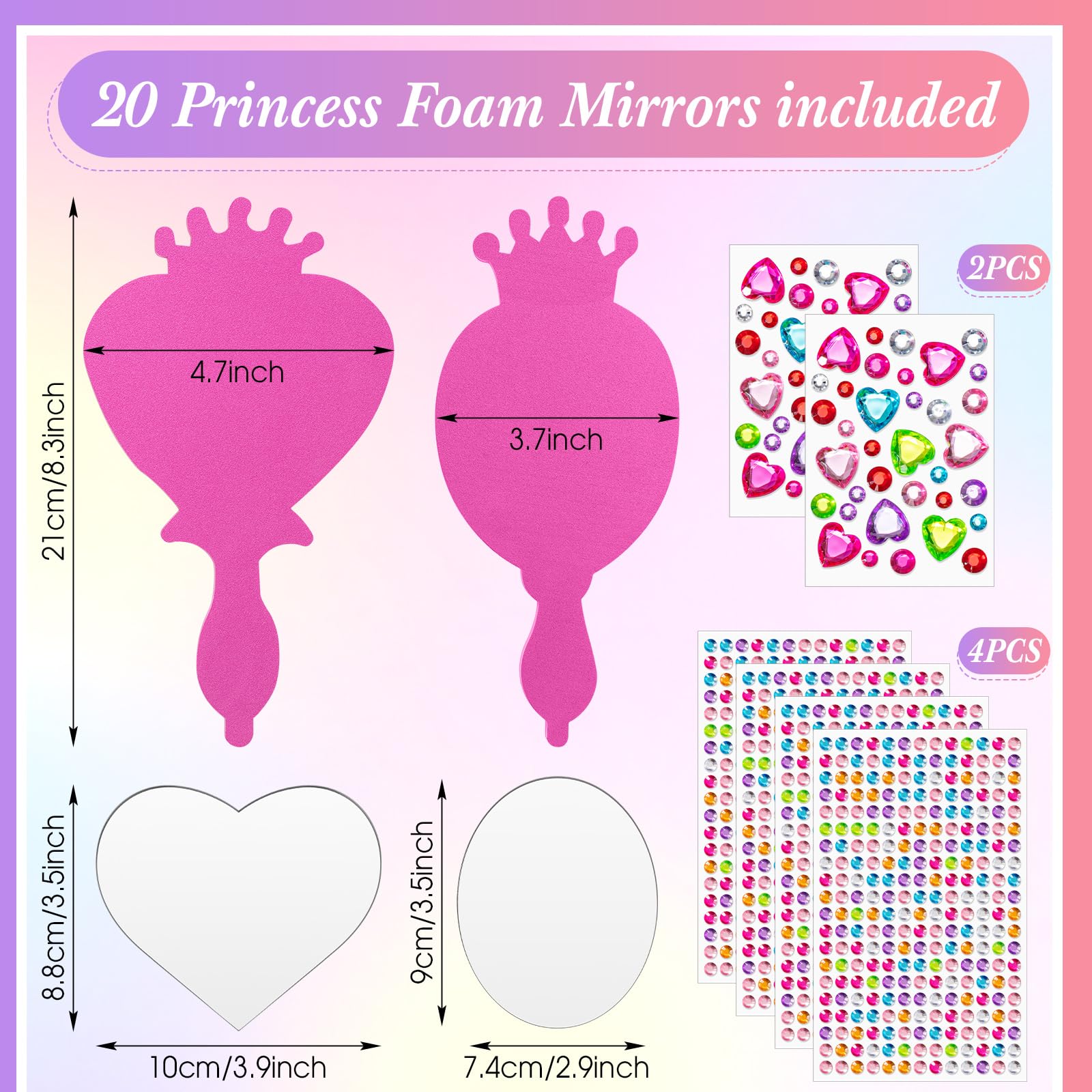 - Q: How many mirrors and stickers are included in the package? A: The package includes 20 unfinished princess mirrors along with 6 sheets of DIY rhinestone stickers for decorating.