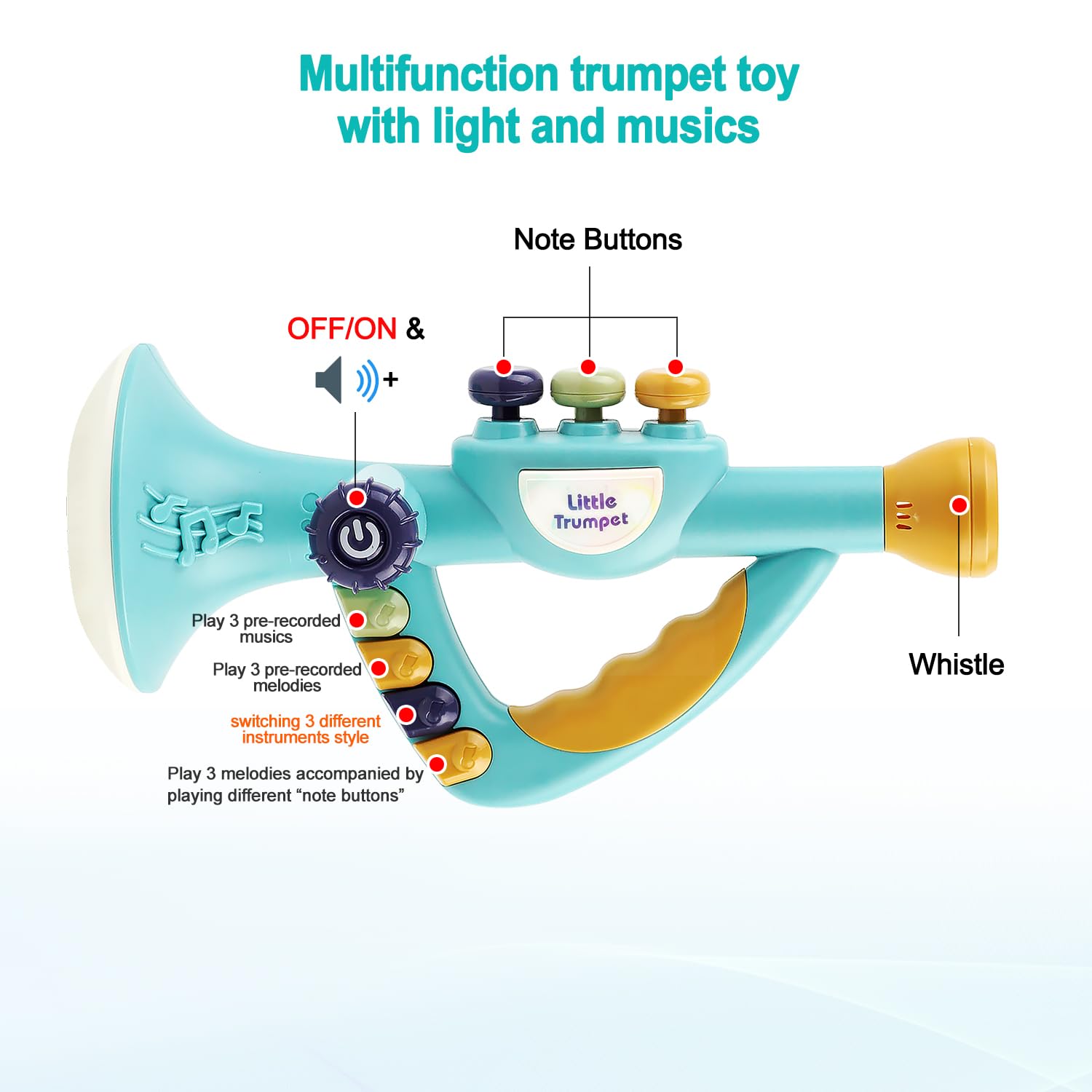 - Q: What instruments are included in this toy set? A: The toy set includes a trumpet, harmonica, and recorder flute, offering a 3 in 1 musical experience for toddlers and encouraging their interest in music.