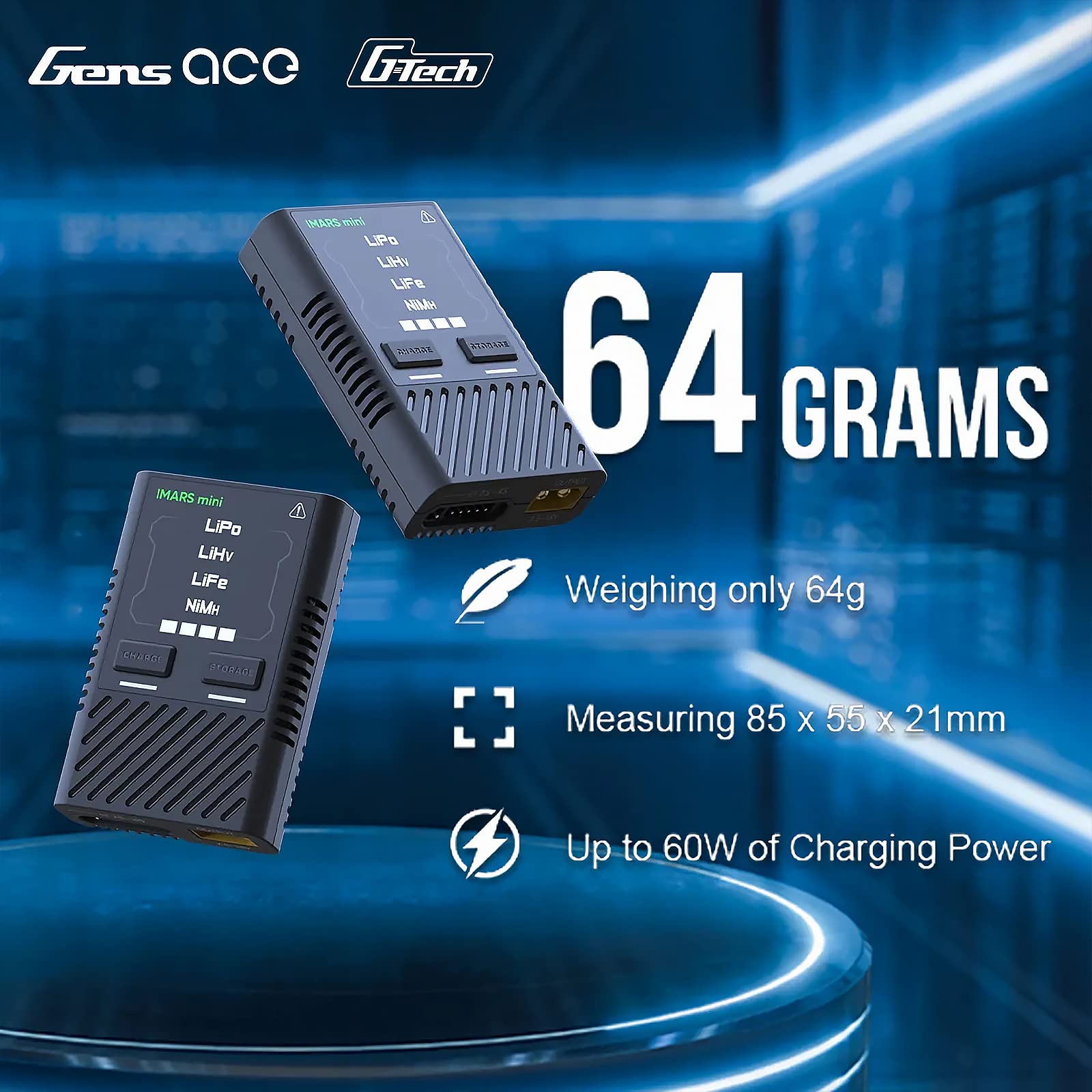 View compareGens ace Imars Mini G-Tech Series 60W Lipo Battery Charger with a 65W Type-C PD Adapter for LiPo/Life/LiHV 2-4S, NiMH 2-12S
