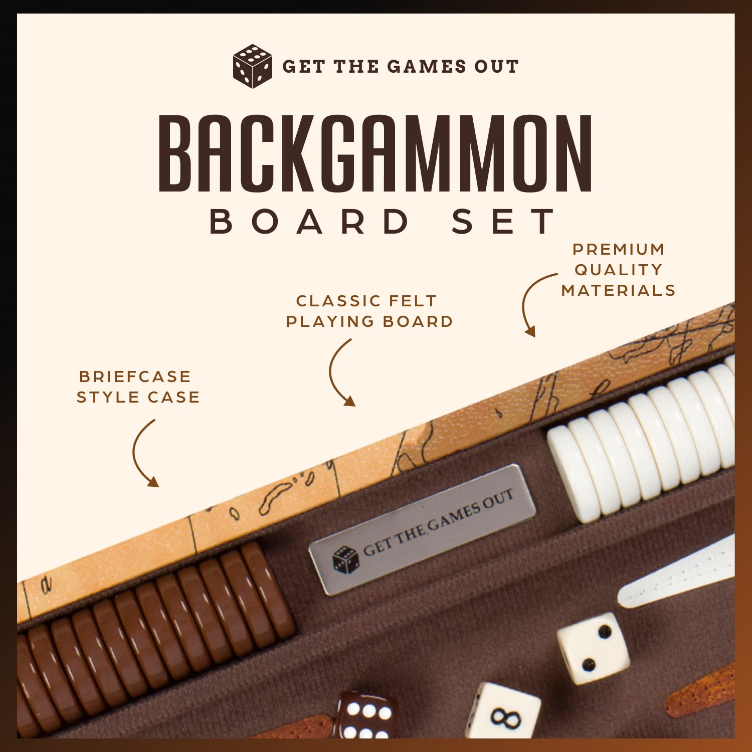 - Q: What is included in the Get The Games Out Top Backgammon Set? A: The Get The Games Out Top Backgammon Set includes a Backgammon Board, Playing Chips, Playing Dice, a Doubling Cube, Dice Shakers, and an Exclusive Strategy & Tip Guide by Get The Games Out.
