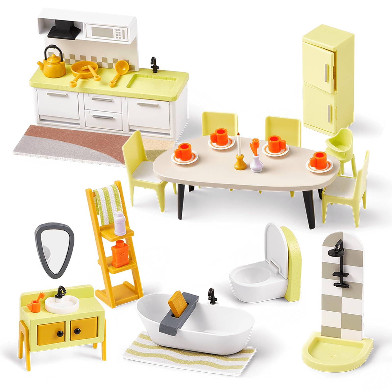 - Q: What kind of accessories are included in the set? A: The set includes a variety of accessories such as cups, plates, a kettle, a pan, a slotted spatula, a soup spoon, candles, a vase with a flower, a toothbrush, a mug, shower gel, shampoo, and a bathtub rack, creating a realistic kitchen and bathroom experience.