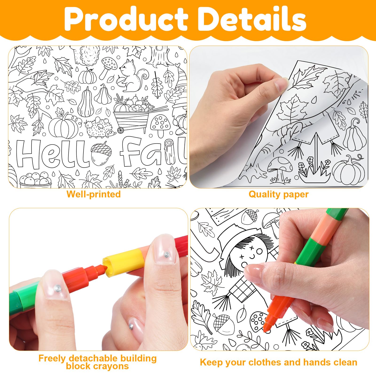 Features: Adorable Pattern: The Paper Coloring Table Cover For Classroom Party Favors Adopts Fall Pumpkin Elements Design Such As Pumpkins, Pine Cones, Gnomes, Maple Leaves, Trees, Scarecrows, Mushrooms, Hedgehogs, Pumpkin Carts, Owls, Squirrels And So On,With Visual Effect, And More For Easy Relaxing Coloring. These Coloring And Activity Posters Set For Boys And Girls Alike Will Relax Your Child And Provide Many Hours Of Learning And Fun. Multiple Uses: This Jumbo Thanksgiving Coloring Posters Are A Classroom Activity To Supply For Kids! A Fun Way For School Activities. These Stacking Crayons And Funny Posters Let Paint And Art Work Funny And Enjoyable. Wide Applicable: The Giant Poster Can Be Placed Anywhere, Such As On The Floor, On The Wall, On The Table, Etc. Large Enough Size Is Ideal For Multiple People To Work Together. Suitable For Parties, Birthday Parties, Class Activities, Parent-Child Activities, Gifts, Etc. Educational Significance: The Rich Patterns Allow Children To Color Freely, Use Their Imagination And Creativity, And Enjoy The Fun Of Art, It Helps Students Learn From Each Other And Creates Opportunities For Children To Show Themselves Warm Tip: Because The Product Is Packaged After Being Folded, There Are Some Creases, But It Does Not Affect The Use Specifications: Material: Posters: Paper Buildable Crayons: Paraffin And Plastic Paper Color: Colorful Size: Coloring Poster: 43 X 31 Inches / 110 X 80 Cm Buildable Crayons: 10Inches/25Cm Package Includes: 1 X Fall Coloring Poster 6 X Stackable Crayons Party Favors Notes: Manual Measurement, Please Allow Slight Errors In Size. The Color May Exist A Slight Difference Due To Different Screen Displays.