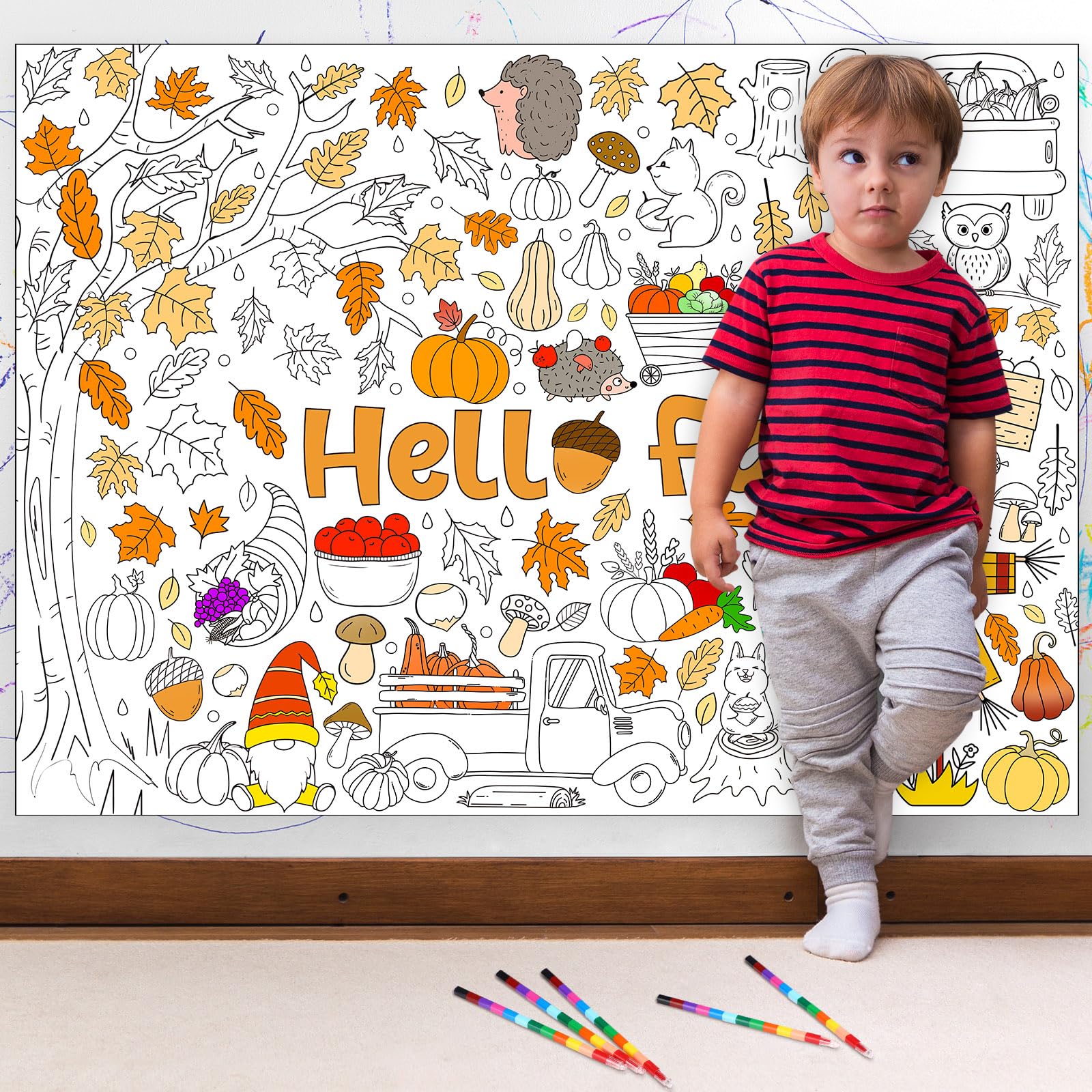 Giant Fall Coloring Poster With 6 Stacking Crayons, Pumpkin Maple Leaf Thanksgiving Party Favor Set Jumbo Wall Art Large Colorin
