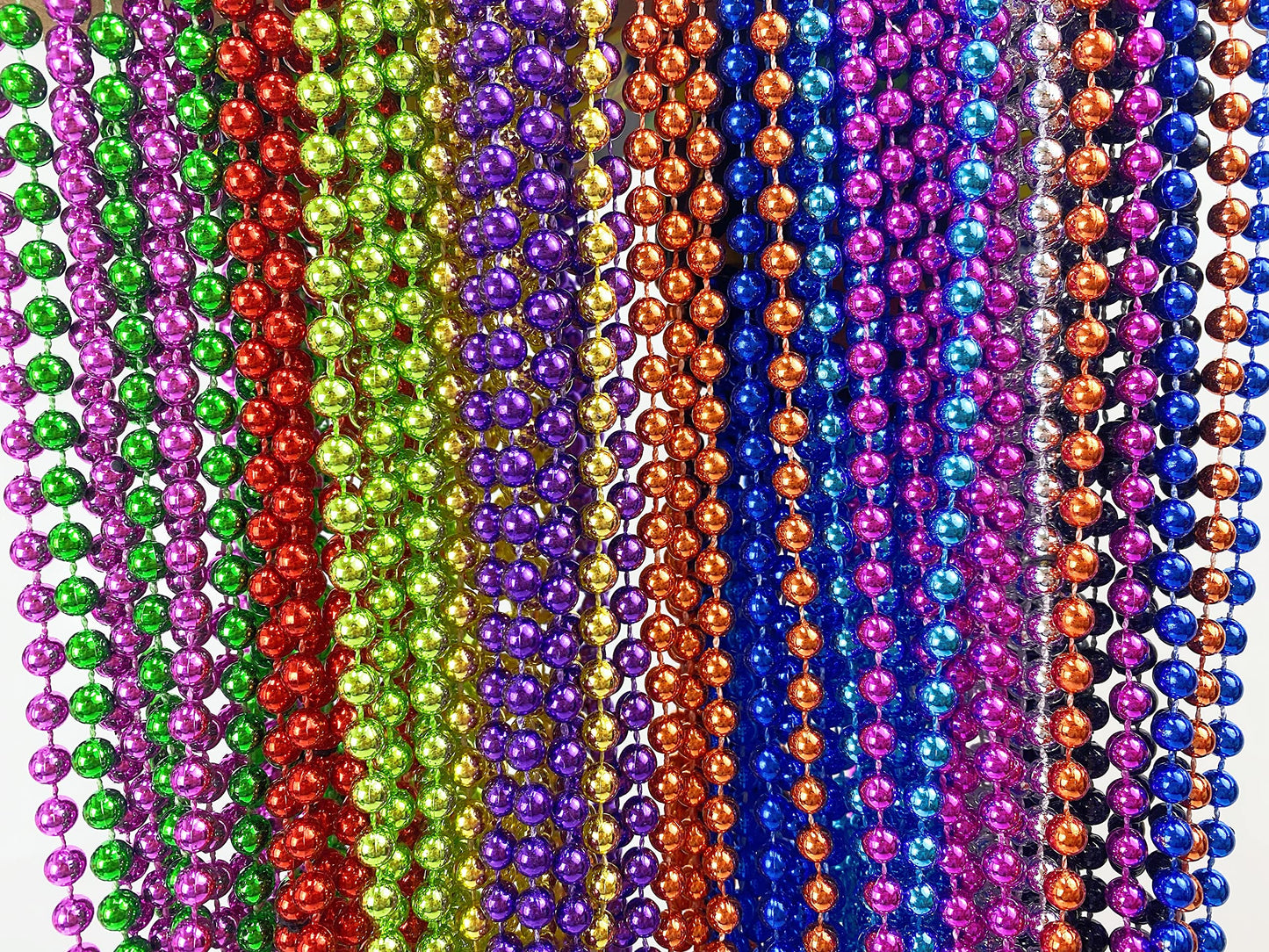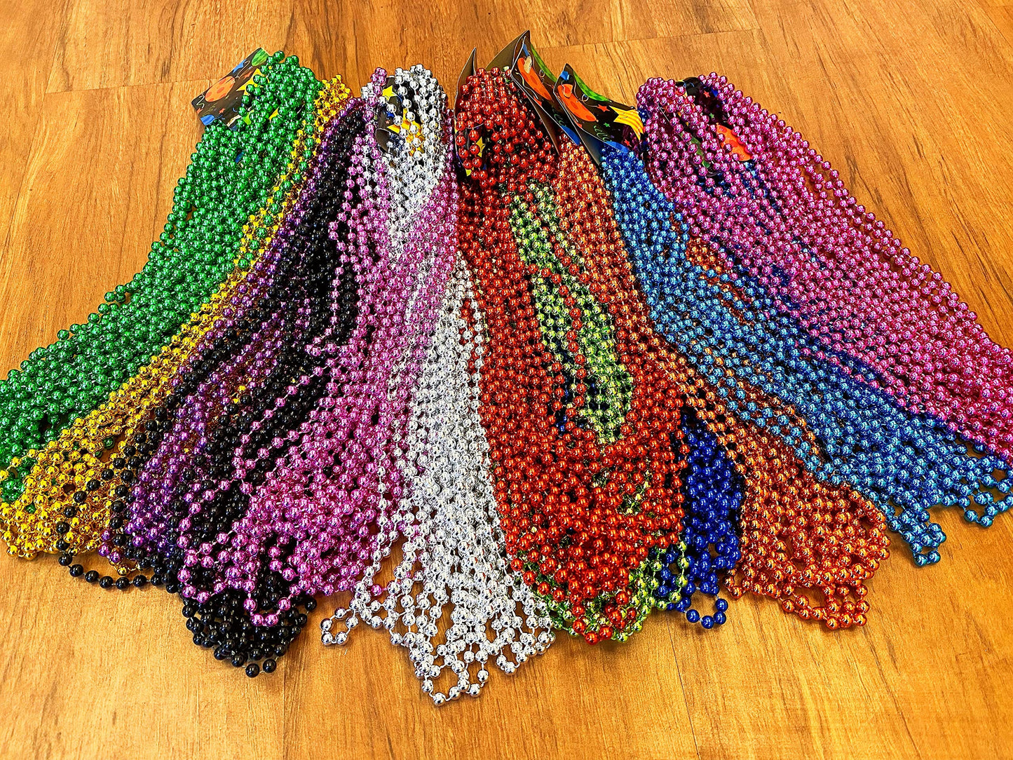 GiftExpress 72 pack of 33'' Metallic Mardi Gras Beads Necklace Bulk Assortment. This beaded necklaces are 33 inches long, and features beads measuring seven millimeters.