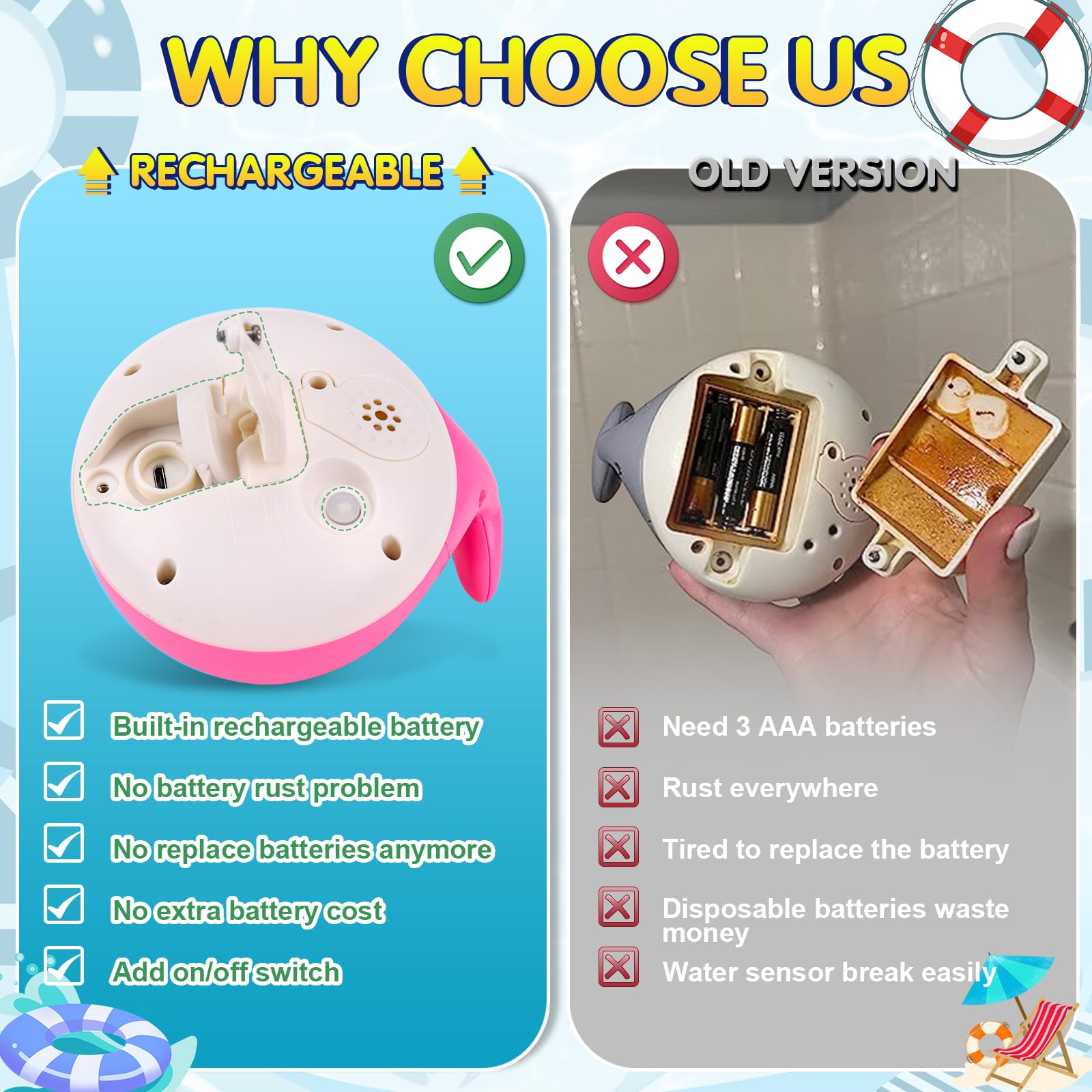 - Q: How does the Gigilli Baby Whale Bath Toy work? A: The Gigilli Baby Whale Bath Toy is equipped with a rechargeable battery that powers an automatic water spray and colorful flashing lights when placed in water. This feature engages your child during bath time, making it a fun experience.