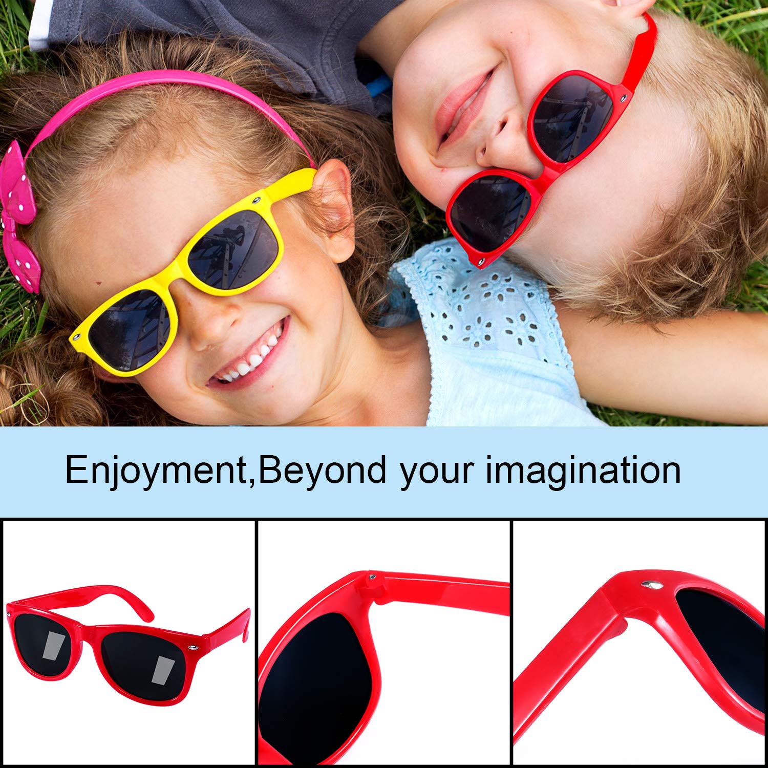 Party Favors & 24 packs 24Pack party sunglasses comes in 6 neon assorted colors( red, orange, yellow, green, blue, and purple),are the ideal party favors for any summer party or event you are holding. Get these bulk sunglasses on, it will change your events from ordinary to cool!UV400 Eye Protection & Polarized Lens Kids Party Sunglasses with UV400 Eye Protection, you can enjoy bathing in the sun.Polarized lens will restore true color, eliminate reflected light and scattered light and protect eyes perfectly, so your eyes are more comfortable and you can see better.High Improved & Safe QualityThe Kids Sunglasses are made of comfortable and sturdy polypropylene material, it will last for long use. And the lightweight frame makes you hardly feel them on your face, gives you a great experience at your everyday use. Fashion and Funny StyleVintage 80s Retro design is fashion and funny for children to take a photo, becomes a favorite among unisex children,teens and youth. The bulk sunglasses will be a best toy gift for kids party favor.Giveaway & Multi-themed Party Our Neon Sunglasses are great for daily use, gifting, parties favors, bachelorette party, birthdays, pool party, easter basket, school party, corporate giveaway, wedding photo booths, bridal parties, team pride events etc.