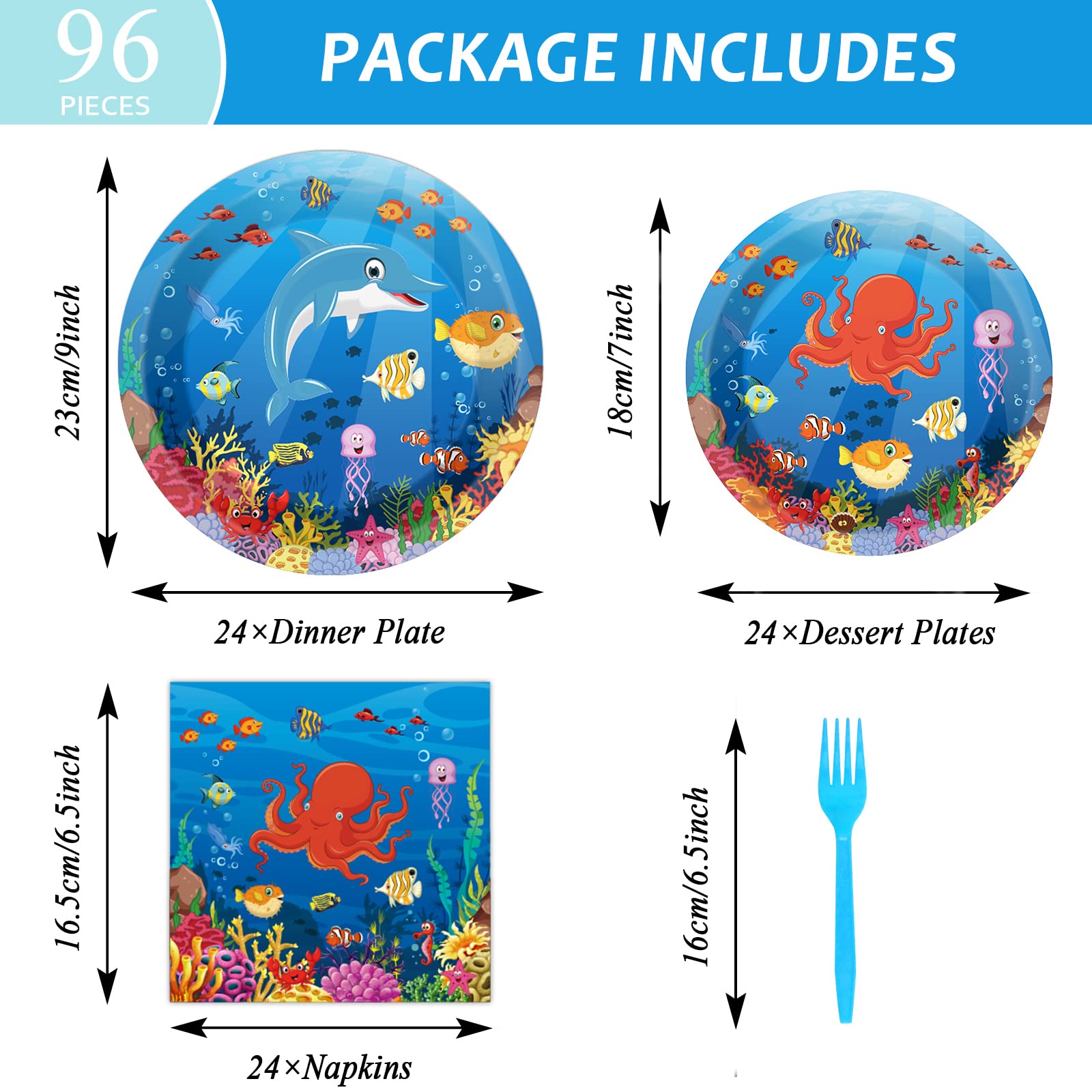 • Q: What is included in the gisgfim Ocean Under the Sea Party Supplies set? A: The gisgfim Ocean Under the Sea Party Supplies set includes 24 pieces of 9’’ dinner plates, 24 pieces of 7’’ plates, 24 ocean-themed napkins measuring 6.5’’, and 24 blue plastic forks, making it perfect for serving 24 guests.