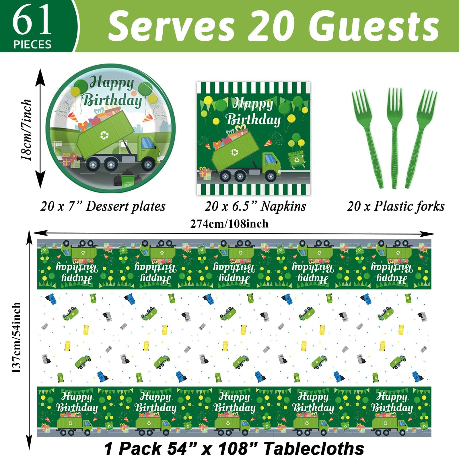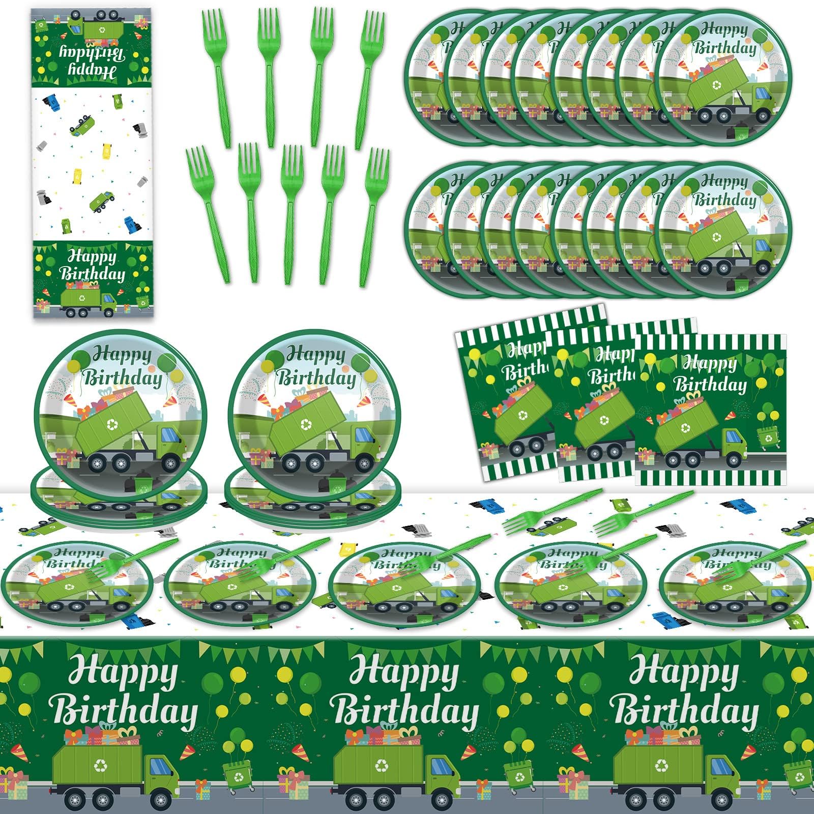 - Q: What items are included in the Garbage Truck Birthday Party Supplies set? A: The Garbage Truck Birthday Party Supplies set includes 20 pieces of 7-inch dessert plates, 20 pieces of 6.5-inch napkins, 20 green plastic forks, and 1 waterproof tablecloth measuring 54 x 108 inches.