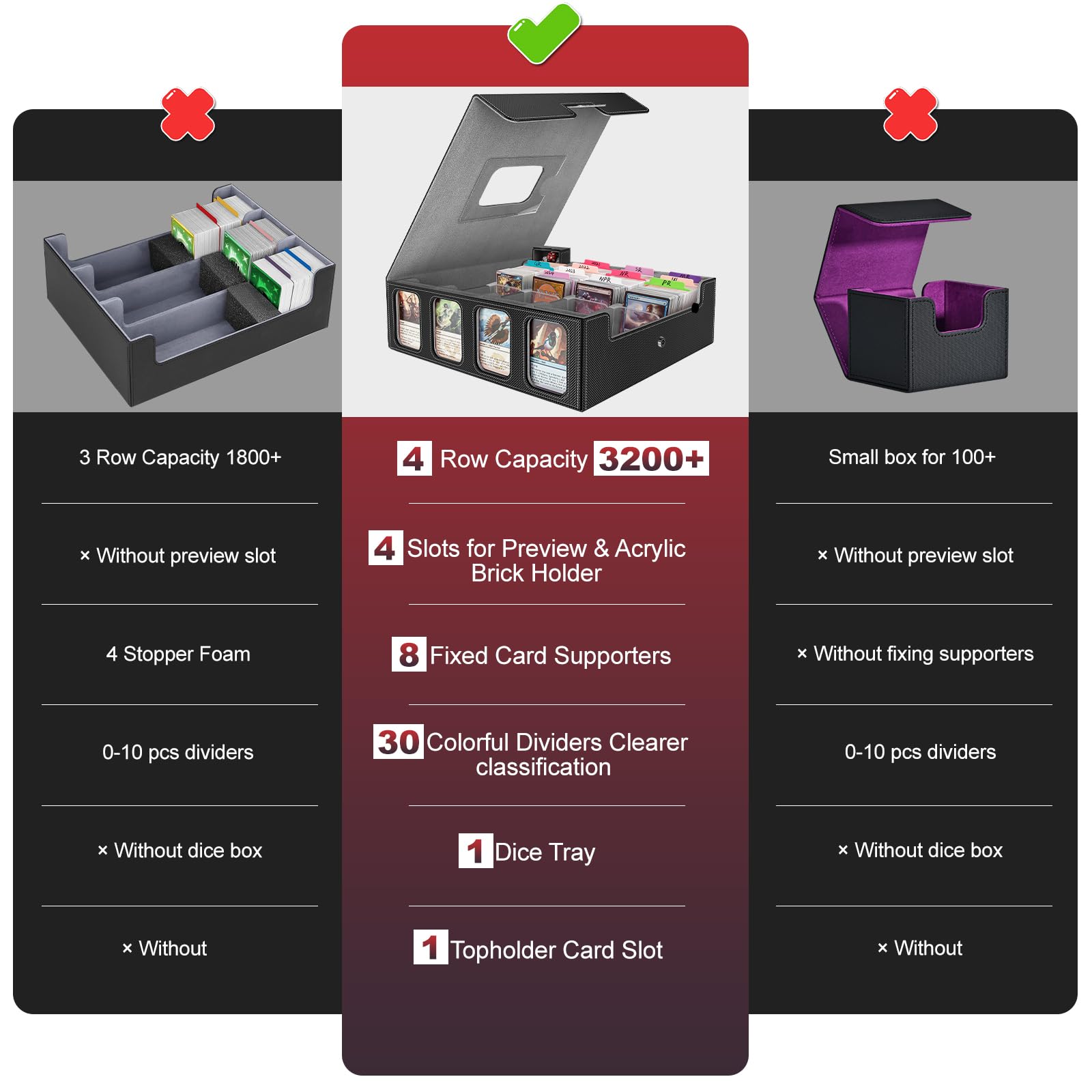View compareGomyrod 3200+ Trading Card Storage Box, 4-Row Deck Box with Handle, Black & Grey, Includes 30 Dividers, 8 Supporters, 1 Dice Tray