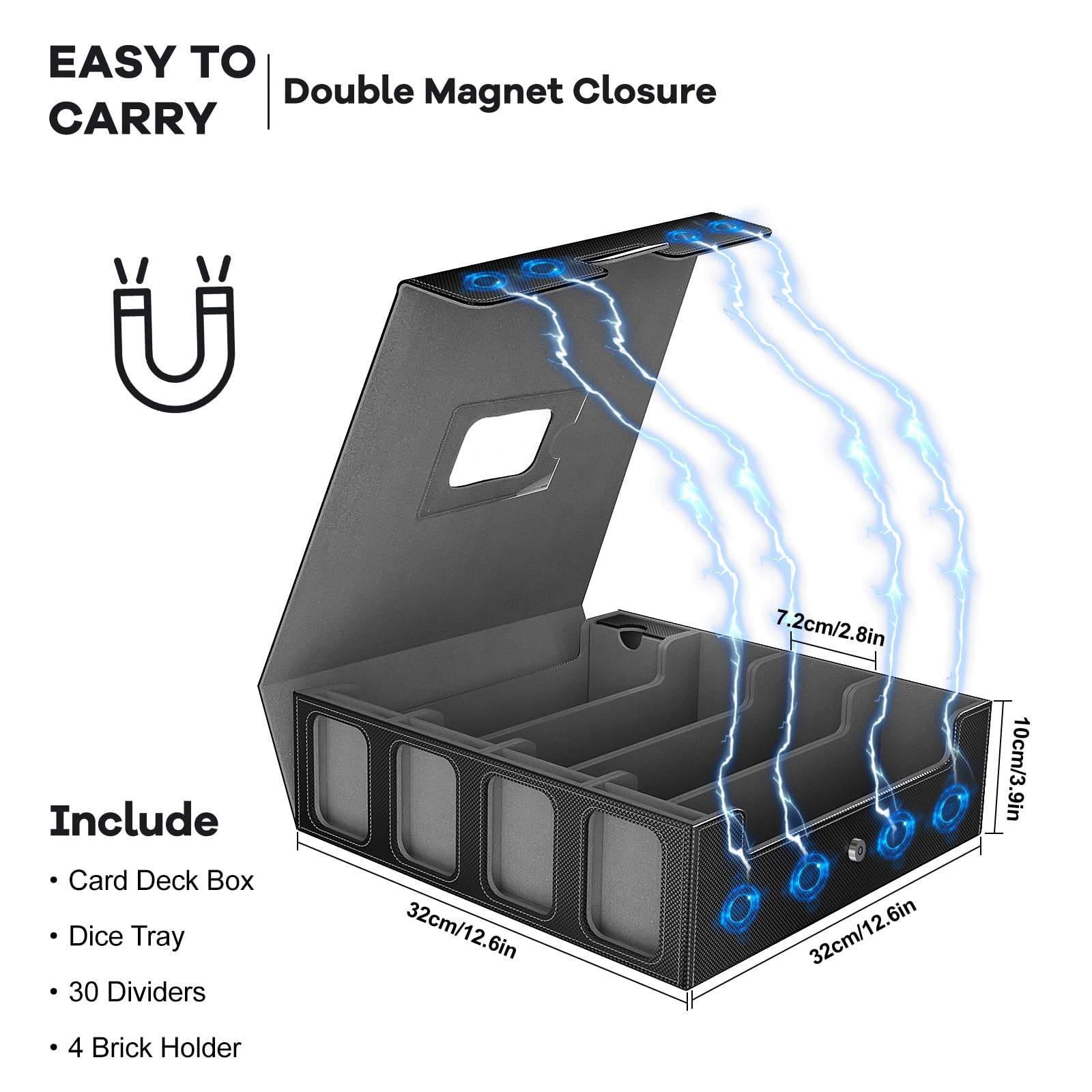 - Efficient Card Organization: This card deck case holder comes with 8 adjustable dividers to keep your cards upright and organized. The inclusion of 30 color-coded labeling tags ensures easy sorting and categorization of your cards and accessories. The strong magnetic closure design secures the deck case, providing complete protection for your cards even when tipped over.