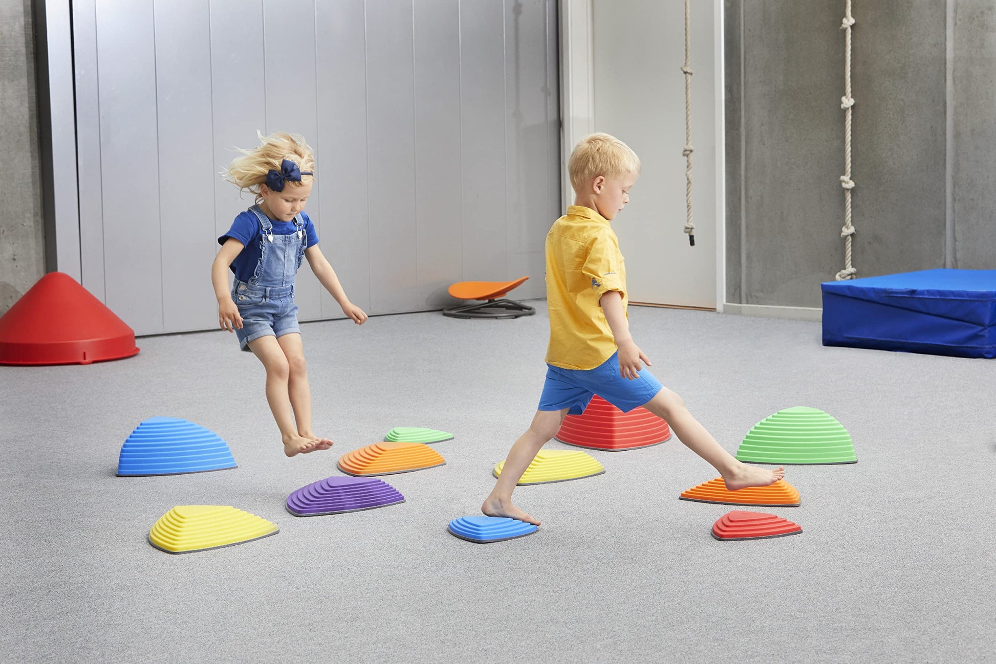 Product DescriptionGONGE River Stones stepping stones for kids are designed to improve coordination and balance. Jumping or stepping from stone to stone develops a child’s confidence in their ability to judge distances. The side of each triangular block varies in steepness and difficulty, and the layout can be changed to make a pathway more or less challenging. Each stone has a non-slip rubber rim, which also protects indoor surfaces. River Stones can be conveniently stacked for storage. Each set includes 6 stones in 6 colors: three measuring 14.96' x 14.56' x 3.35' and three measuring 10.23' x 10.23' x 1.77'.From the ManufacturerStepping stones to better coordination, balance, and fun. The Riverstones are inspired by stepping stones in a river with each side of the triangle varying in steepness and difficulty. The purpose is to jump from stone to stone without touching the floor - you can vary the position of the stones to create more challenging paths for advanced children. Each stone has rubber studs on the base which prevent them from slipping, and also protect indoor floor areas. Builds children’s confidence when jumping, judging distances, coordinating and balancing. Set of 6 riverstones. Can withstand weights up to 110lbs. Grades PreK-3. Ages 3-7.