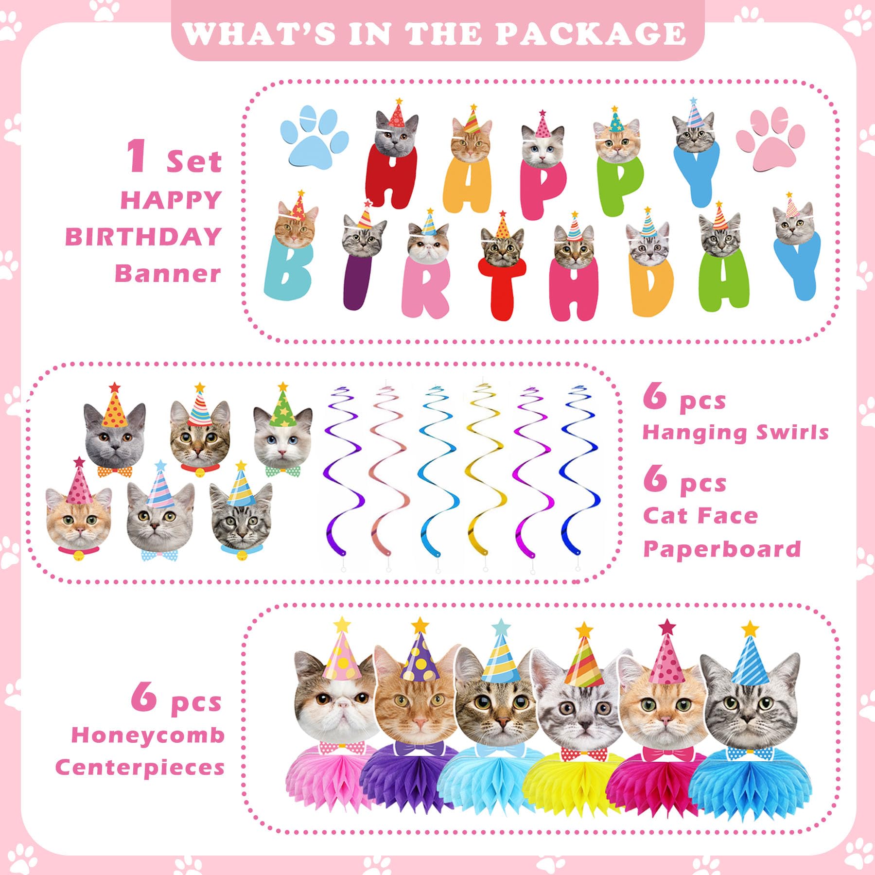 - Q: What items are included in the GOYOSWA Cat Themed Birthday Decorations set? A: The GOYOSWA Cat Themed Birthday Decorations set includes 1 colorful cat happy birthday banner, 6 honeycomb centerpieces in different colors, 6 hanging swirls, and 6 cat cutouts, making it perfect for a cat-themed party.