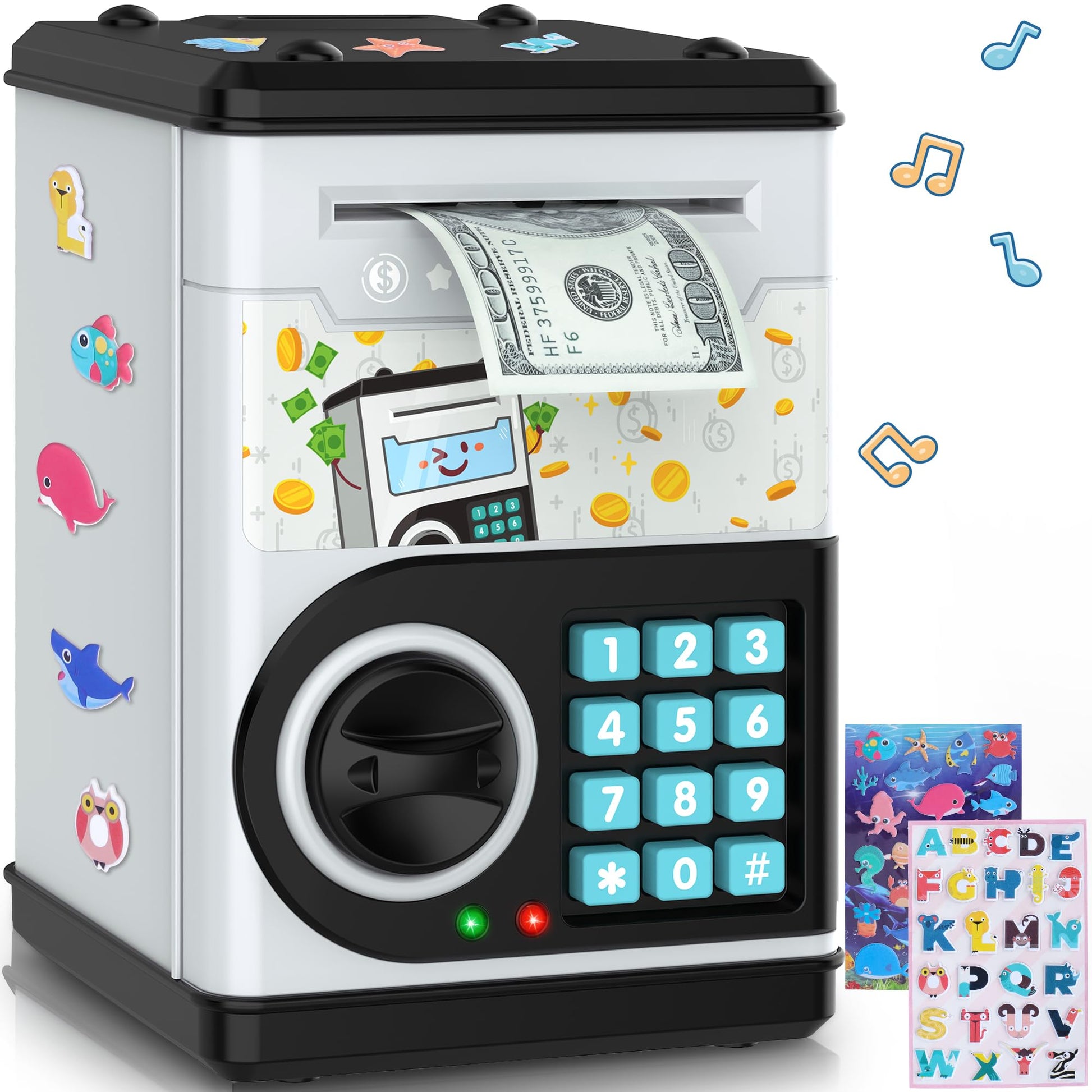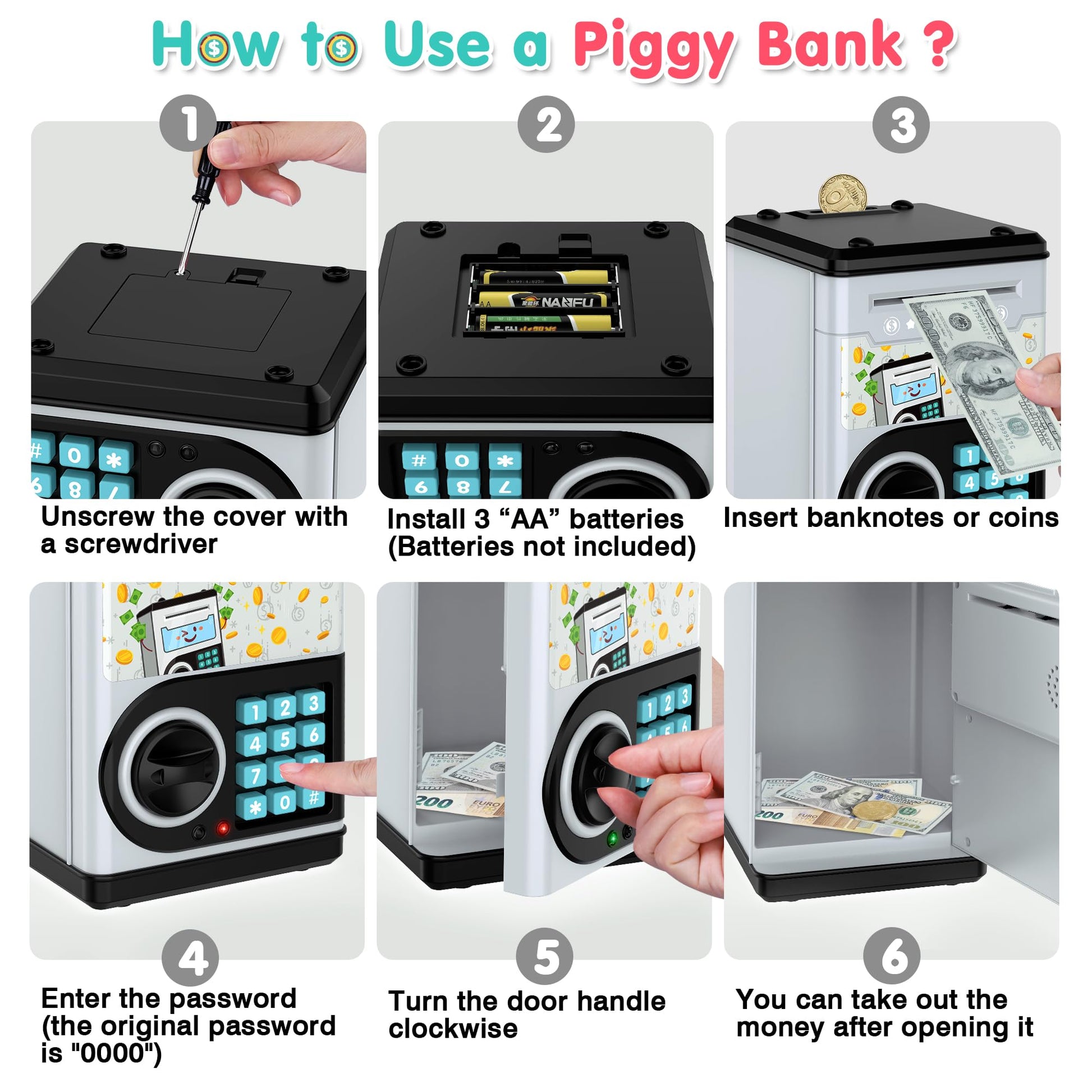 - Q: Can this piggy bank hold both coins and banknotes? A: Yes, the Gray Piggy Bank features a slot on top for inserting banknotes, which will be automatically rolled into the ATM machine inside. It also has a small opening for inserting coins, making it versatile for saving both types of currency.