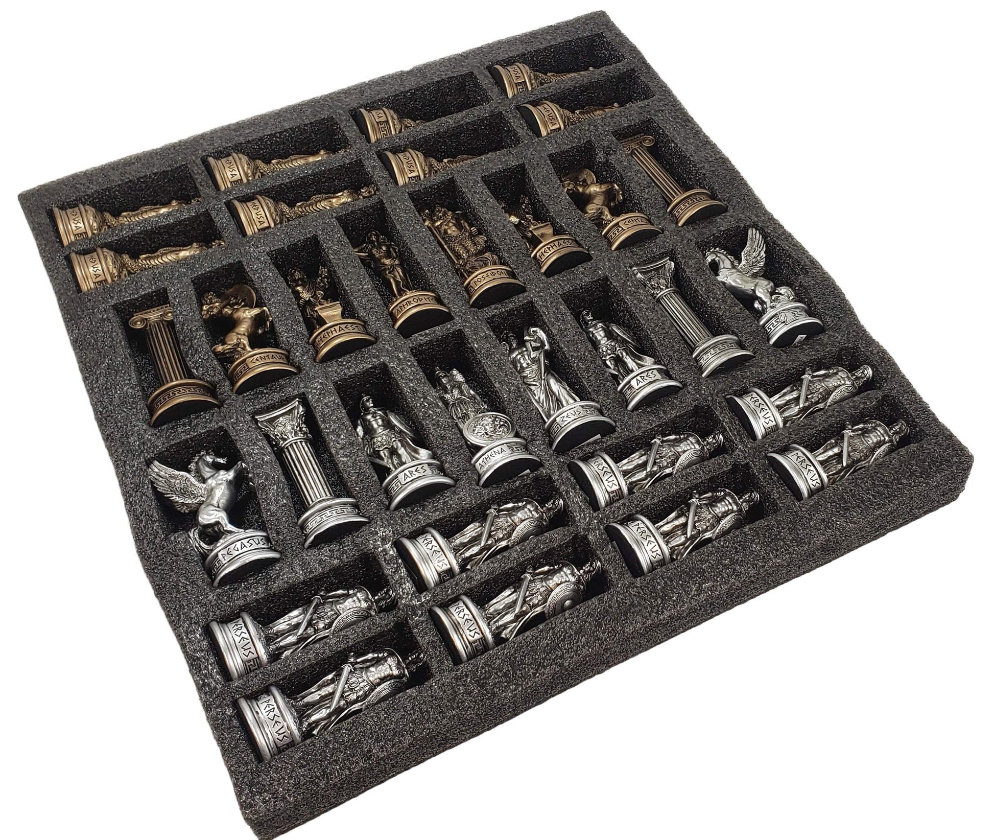 - Q: Is a chess board included with the Zeus vs Poseidon chess pieces? A: No, this set does not include a chess board. It is a standard 32-piece set of chess men only, designed to be compatible with any standard chess board.