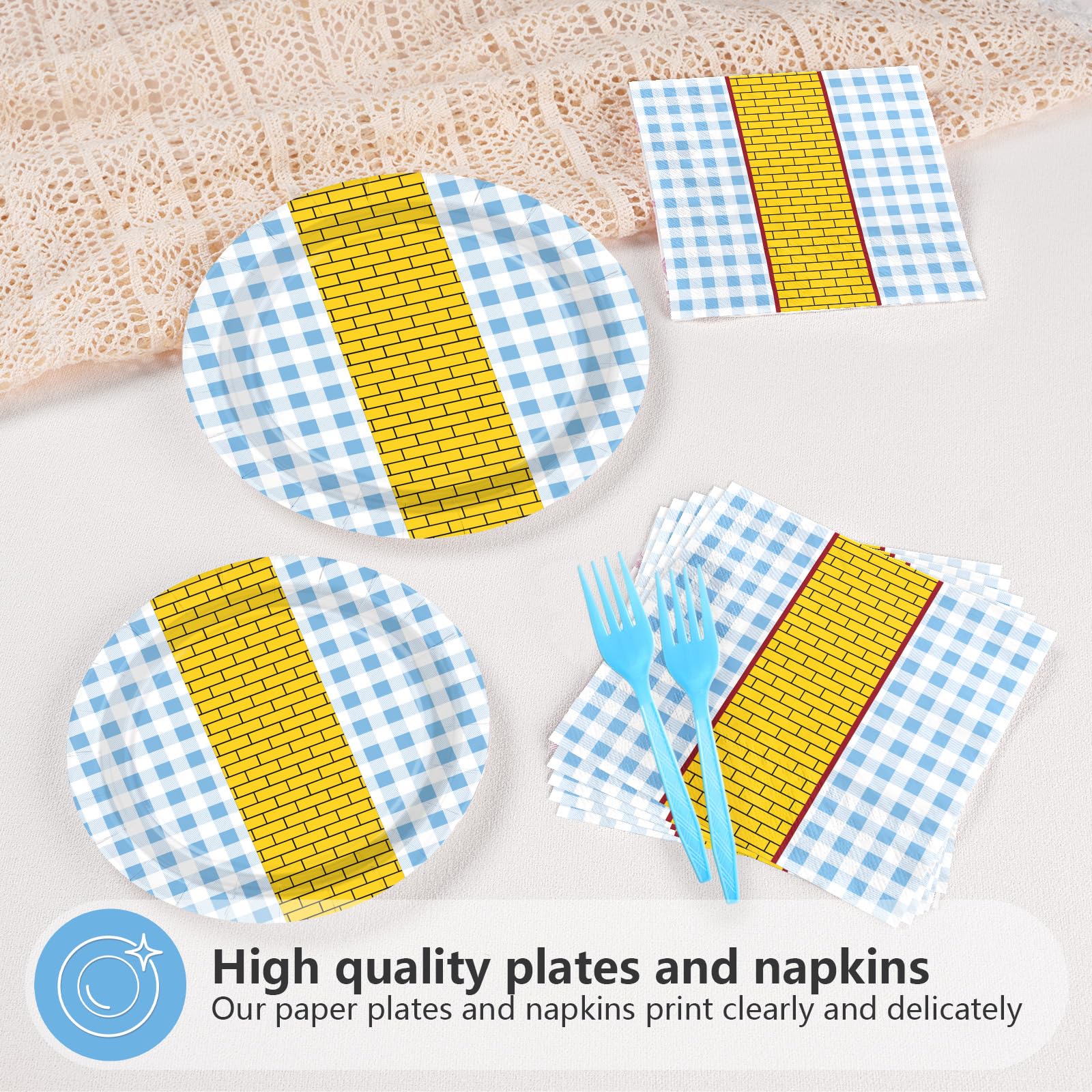 Grencian 96 Pcs Yellow Brick Party Supplies Light Blue Gingham Paper Plates Wizard Party Decorations Tableware for Witch Princes