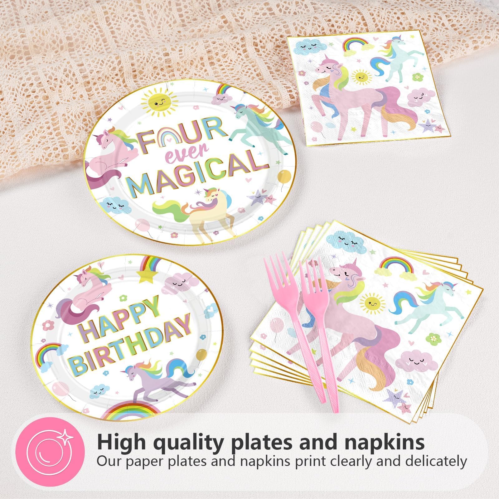 Grencian 96Pcs Unicorn 4th Birthday Party Supplies Magical Pastel Rainbow Unicorn Plates and Napkins Disposable Unicorn Party De