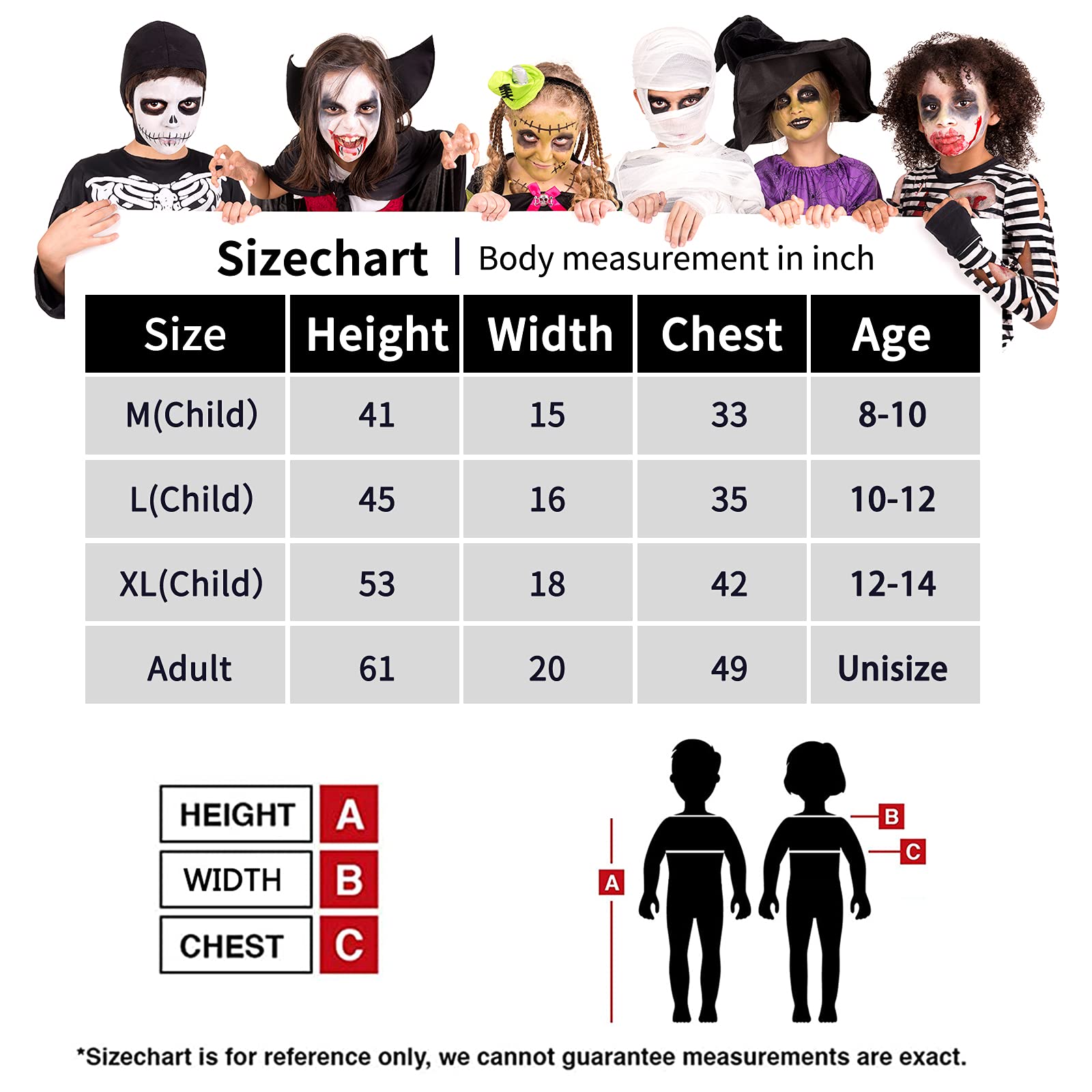 - Q: What are the size dimensions for the X-Large costume? A: The X-Large costume is suitable for children aged twelve to fourteen, with a chest measurement of forty-two inches, shoulder width of eighteen inches, and a length of fifty-three inches.