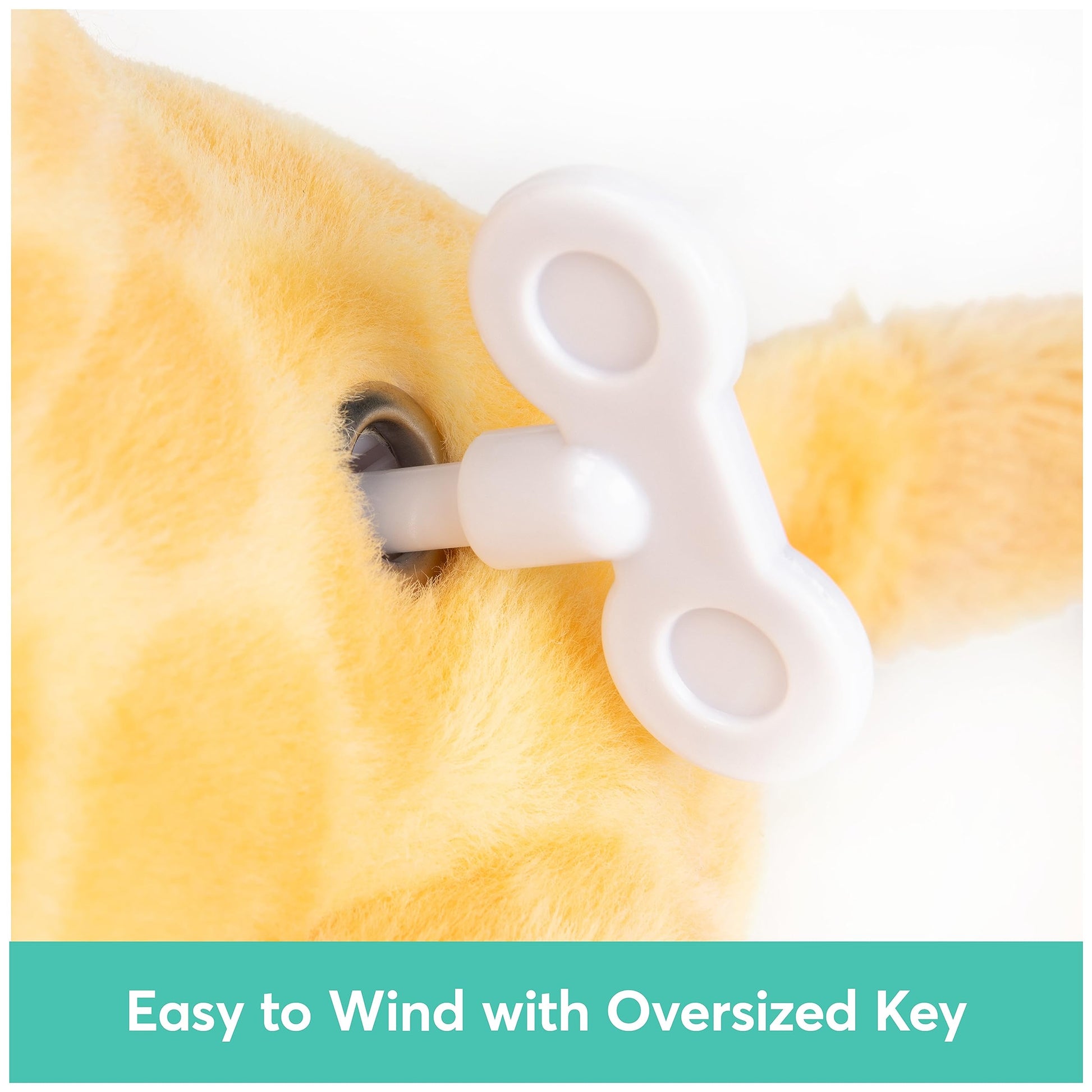 - Q: How does the keywind mechanism work on this plush giraffe? A: To activate the giraffe's musical feature, simply wind the key located just above its tail. Once wound, the giraffe will sway left and right while playing Brahms’ Lullaby, providing a soothing experience for your baby.
