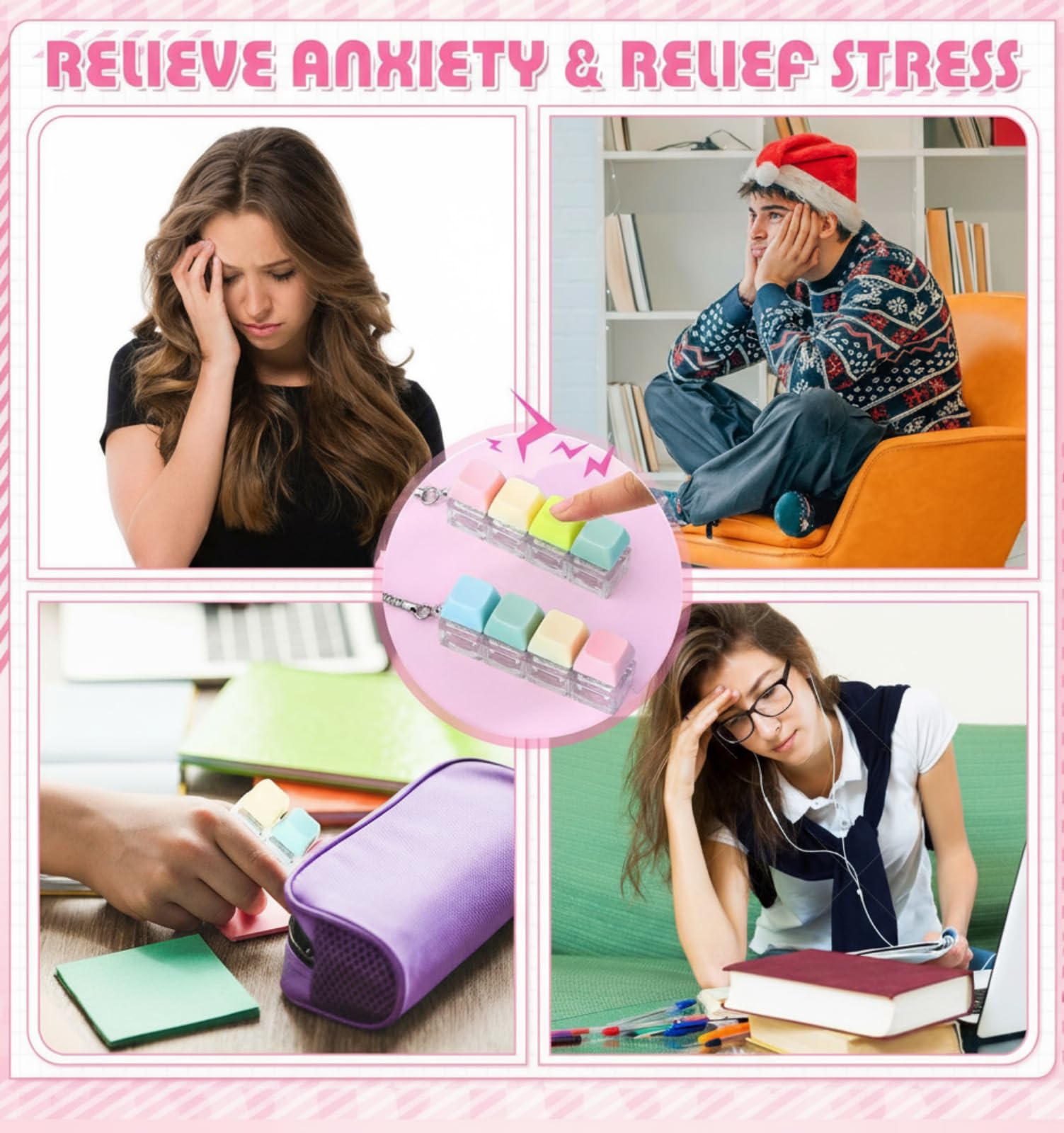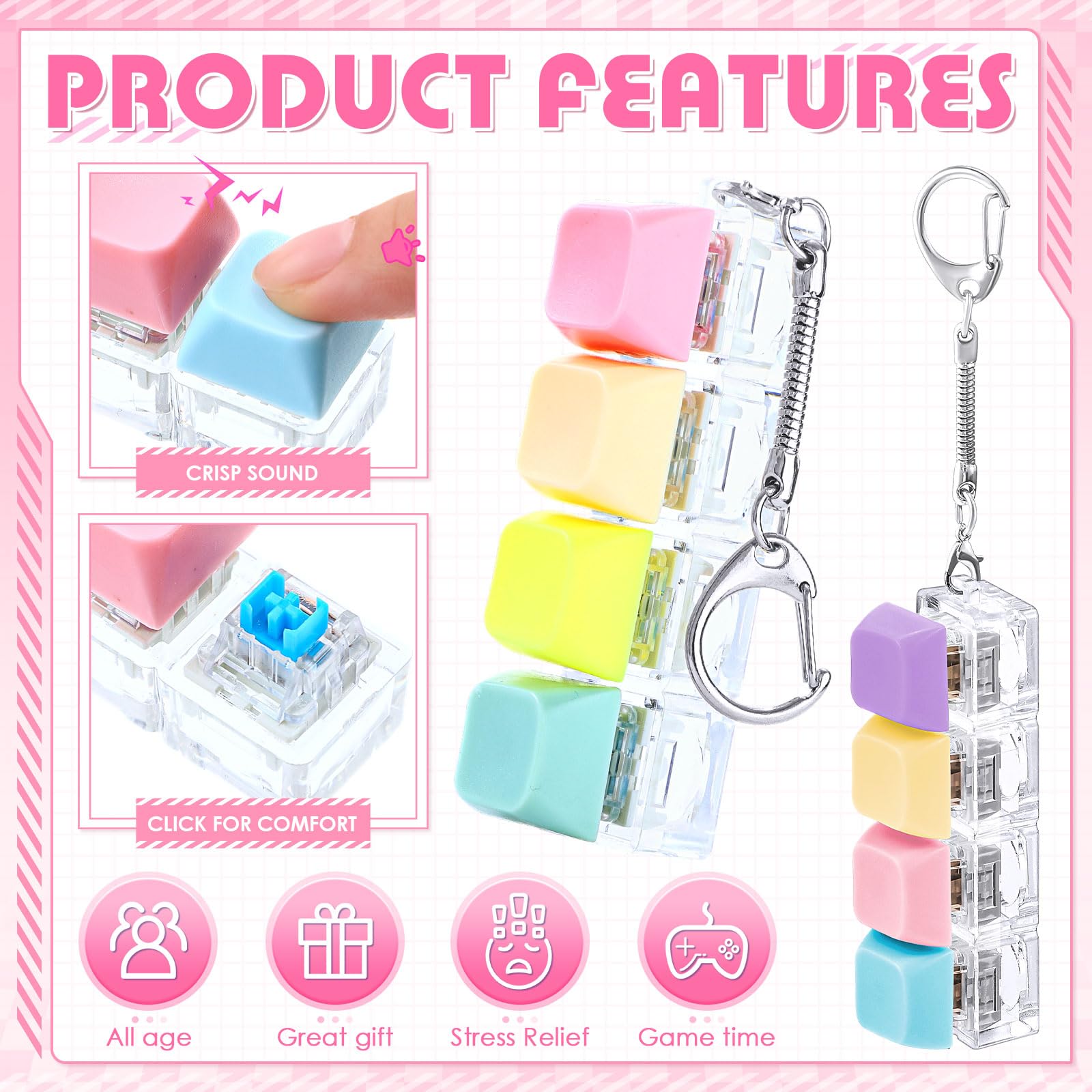 Features: Get 4 pcs Keyboard Fidget Keychain. Multiple keychains can be shared with family and friends. Mix and match them in various colors as you like to show your unique fashion charm. The sound and bounce of the Keyboard Fidget Toy can help you relieve stress and is mini for easy carrying to many places like office school travel Specifications: Material: Keycap: ABS material Bottom: PC material Color: Keycaps: macaron colors Bottom: transparent white Size: Keyboard about 7.6 x 2 x 2.7cm / 2.99 x 0.79 x 1.06 inches. Chain about 2.75 inches / 7cm Weight: 26g Package includes: 4 x Keyboard Fidget Keychain Notes: Manual measurement please allow slight errors on size. The color may exist a slight difference due to different screen displays