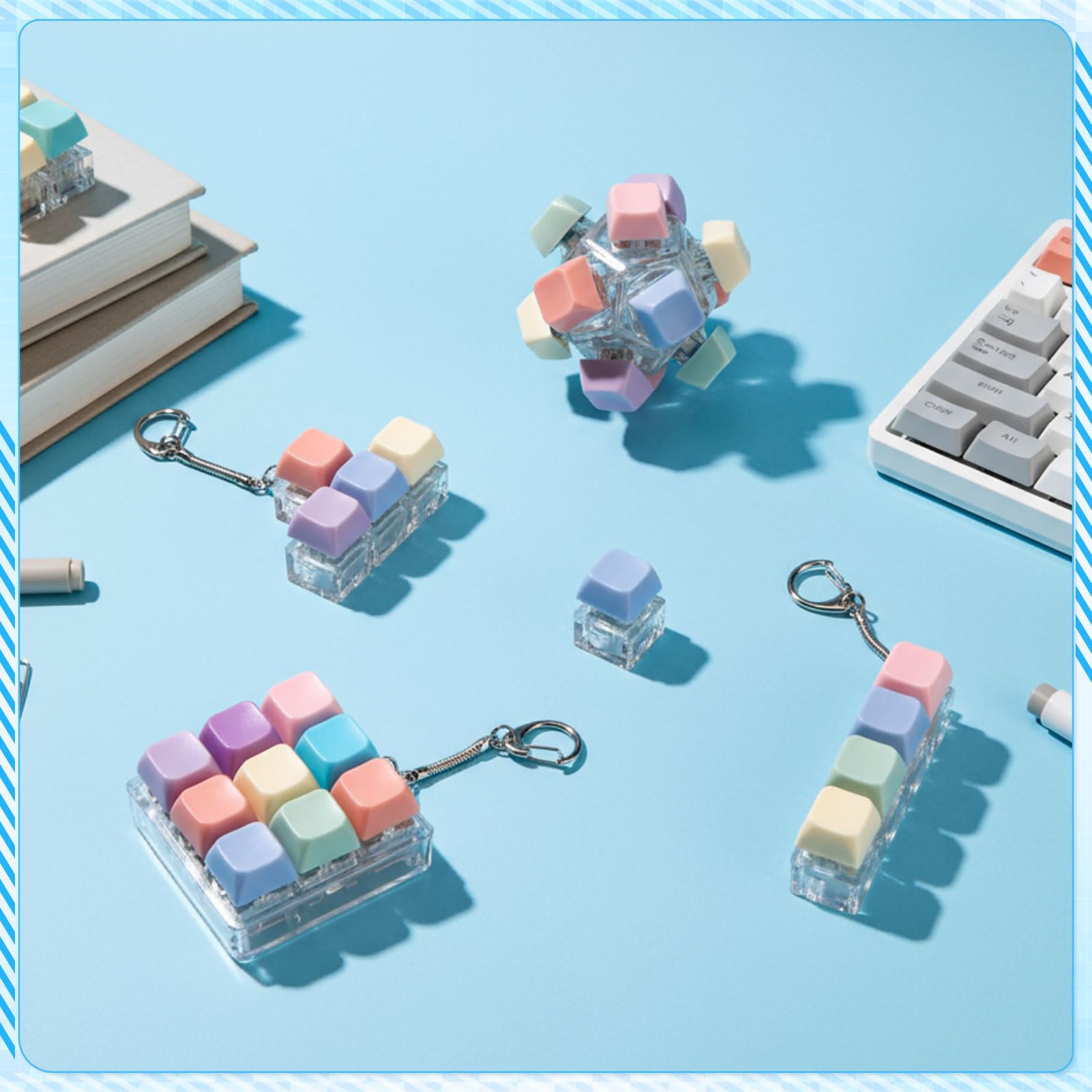 Halloscume 5 Pcs Keyboard mature-themed Fidget Toy Clicker Toy in 5 Styles Keyboard Fidget Keychain Cube Mechanical Key Button Clicker Stress Relief Gift for Office Home Pass Time (Pastel Colors)