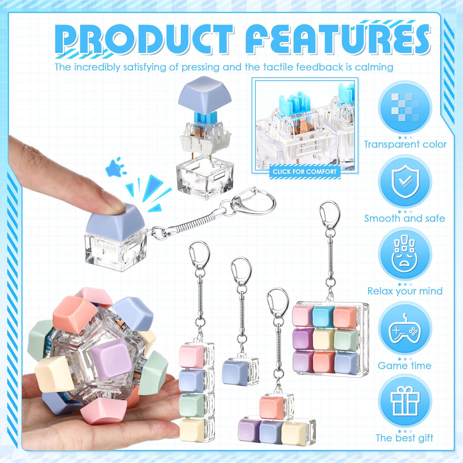 Features: You will get 5pcs different styles of keyboard fidget toy which are sufficient to meet your diverse gaming needs. If you are looking for an interesting stress-relieving toy to relieve stress this clicker fidget toy is definitely worth considering! Whether it's a birthday a festival a party or a little surprise in daily life keyboard fidget keychains can make the recipient feel full of care while playing and easily become the first choice for giving gifts. Specifications: Category: safety products Material: PC material Color: Keycaps: pastel colors Bottom: transparent colors Size: Single key keyboard about: 0.787 x 0.787 x 1.06 in/ 2 x 2 x 2.7 cm 4 Keys keyboard about: 2.99 x 0.787 x 1.06 in/ 7.6 x 2 x 2.7 cm T-shaped key keyboard about: 2.17 x 1.38 x 1.06 in/ 5.5 x 3.5 x 2.7 cm 9 Keys keyboard about: 2.36 x 2.36 x 1.06 in/ 6 x 6 x 2.7cm 12 Keys keyboard about: 2.87 in/ 7.3 cm Key chain about: 2.75 in/ 7cm Style: 5 styles Package includes: 5 x Keyboard fidget keychain Notes: Manual measurement please allow slight errors on size. The color may exist a slight difference due to different screen displays