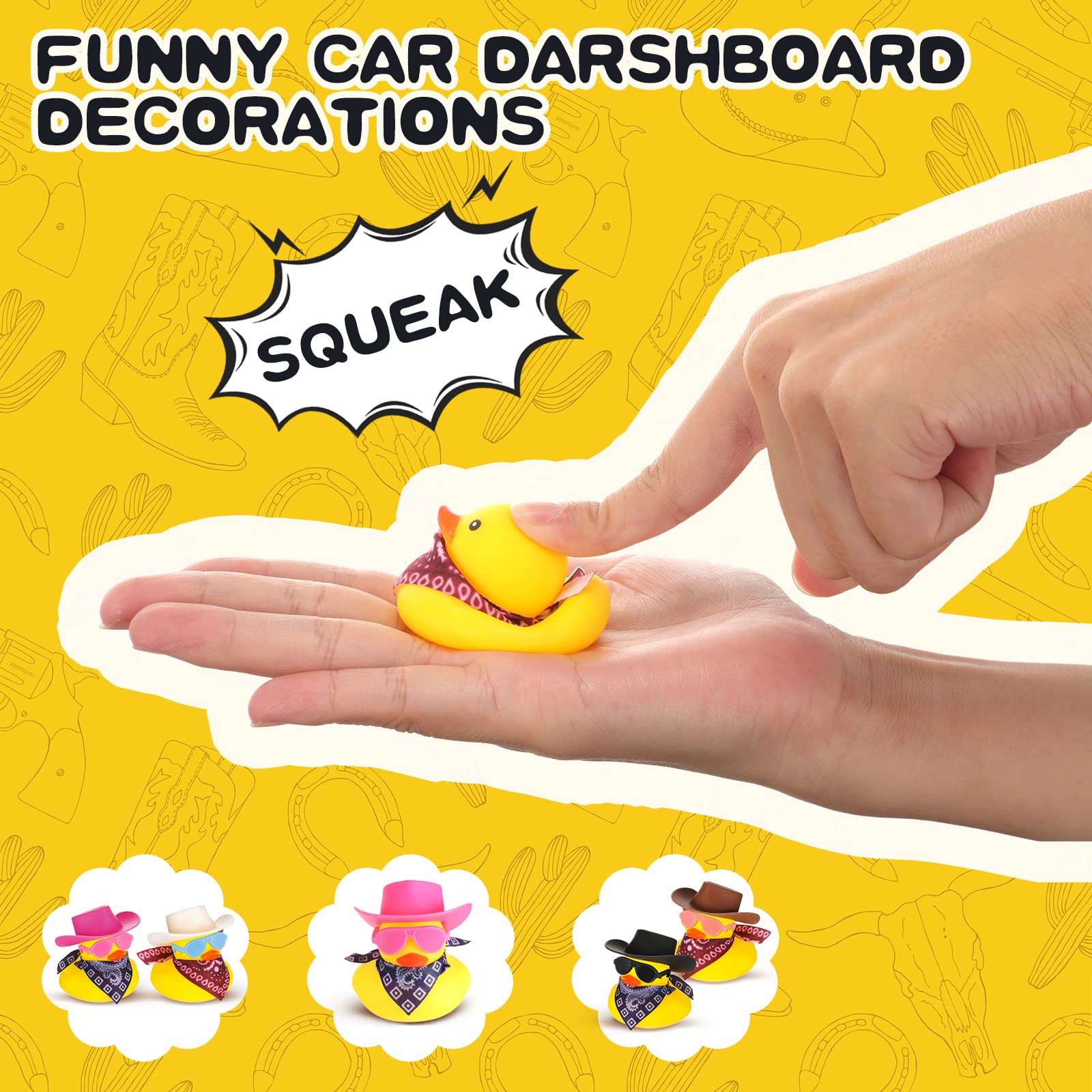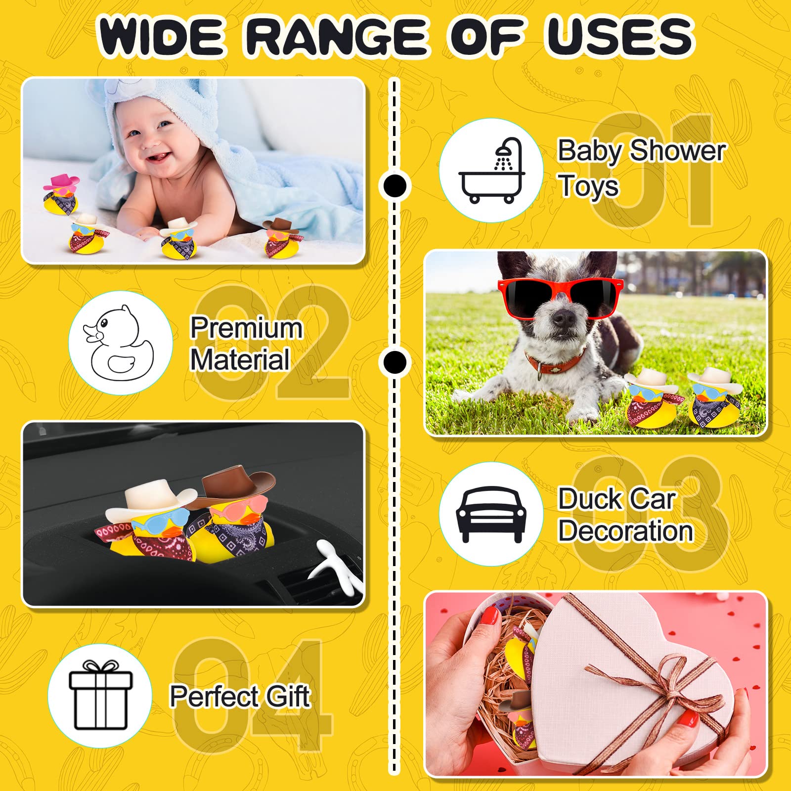 Features: Sweet gift choice: You can send these rubber ducks as gifts to your family friends and other people who have babies on birthday or other festivals. The duck toy gifts can help to show your sweet love and appreciation to them. Convenient to carry: The duck toys are lightweight and convenient to take with you when you go swimming or taking a shower with your baby. Specifications: Main material: rubber Main color: yellow Size: Mini rubber duck toys: about 2.17 x 1.89 x 1.77 inches/ 5.5 x 4.8 x 4.5 cm Package includes: 24 x Mini rubber duck toys 24 x Mini cowboy hats 24 x Mini scarves 24 x Mini sunglasses 2 Sheets adhesive dot Notes: Manual measurement please allow slight errors on size. The color may exist a slight difference due to different screen displays. Young users should use under mature-themed supervision. Tips: the scarf sunglasses hat and duck are separated you can use glue points double sided tape and so on to fix the hat and the duck they are very fun and cute to match.