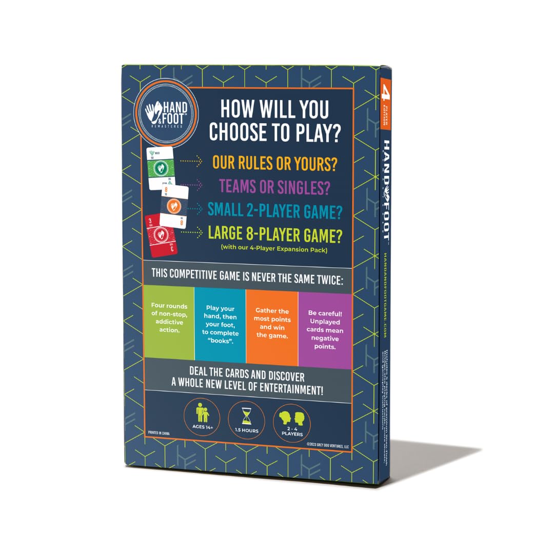 The Point Of The Game Is Simple. Collect Cards To Earn Points While Discarding Cards To End The Round. The Player With The Most Points At The End Wins. How You Choose To Play Is Not As Simple. Will You Collect As Many Points As You Can? Or Try To End The Round Quickly To Stick Your Opponents With Negative Points? Or Maybe Play It Safe While The Others Fight It Out And You Hope For A Bit Of Luck? No Matter How You Play, This Fun And Competitive Game Is Never The Same Twice. Our 300 Gsm, Linen-Finish, Bridge-Sized Cards Were Created Specifically For Hand And Foot To Make This Addictive Game: Easier To Learn With No More Needless Suits Or Confusing Book Colors. Easier To Keep Score With Card Values On The Face Of The Cards. Easier To Separate Decks With The Back Of Each Deck A Different Color. Even More Enjoyable To Play Than With Traditional Playing Cards. This Expanded Game Set Includes 5 Decks Of Cards For Up To 4 Players (2 Teams), Instructions, And A 25 Sheet Hand And Foot Remastered Score Pad.