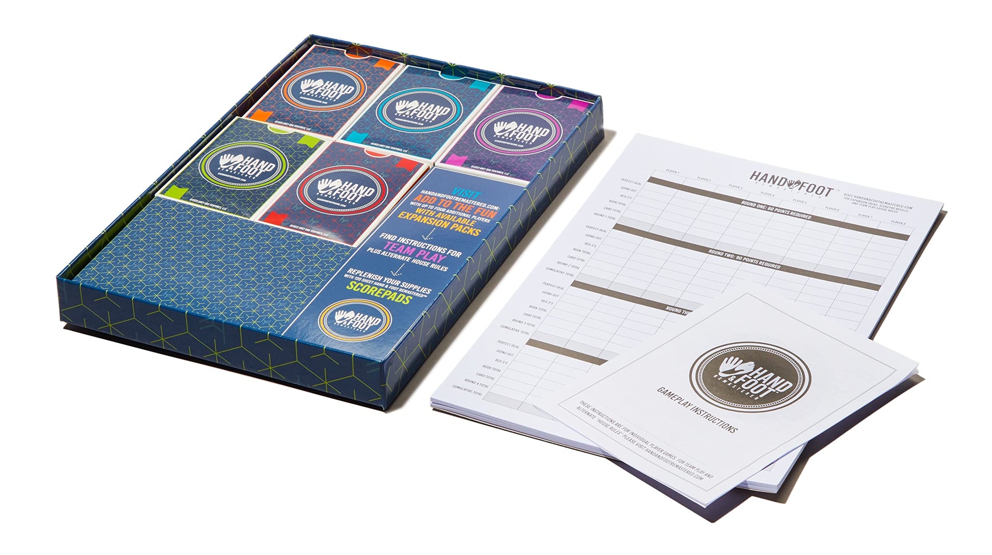 - Q: What items are included in the Hand & Foot Remastered game set? A: The set includes 5 decks of cards, a 25-sheet score pad, and game instructions, providing everything you need to start playing.