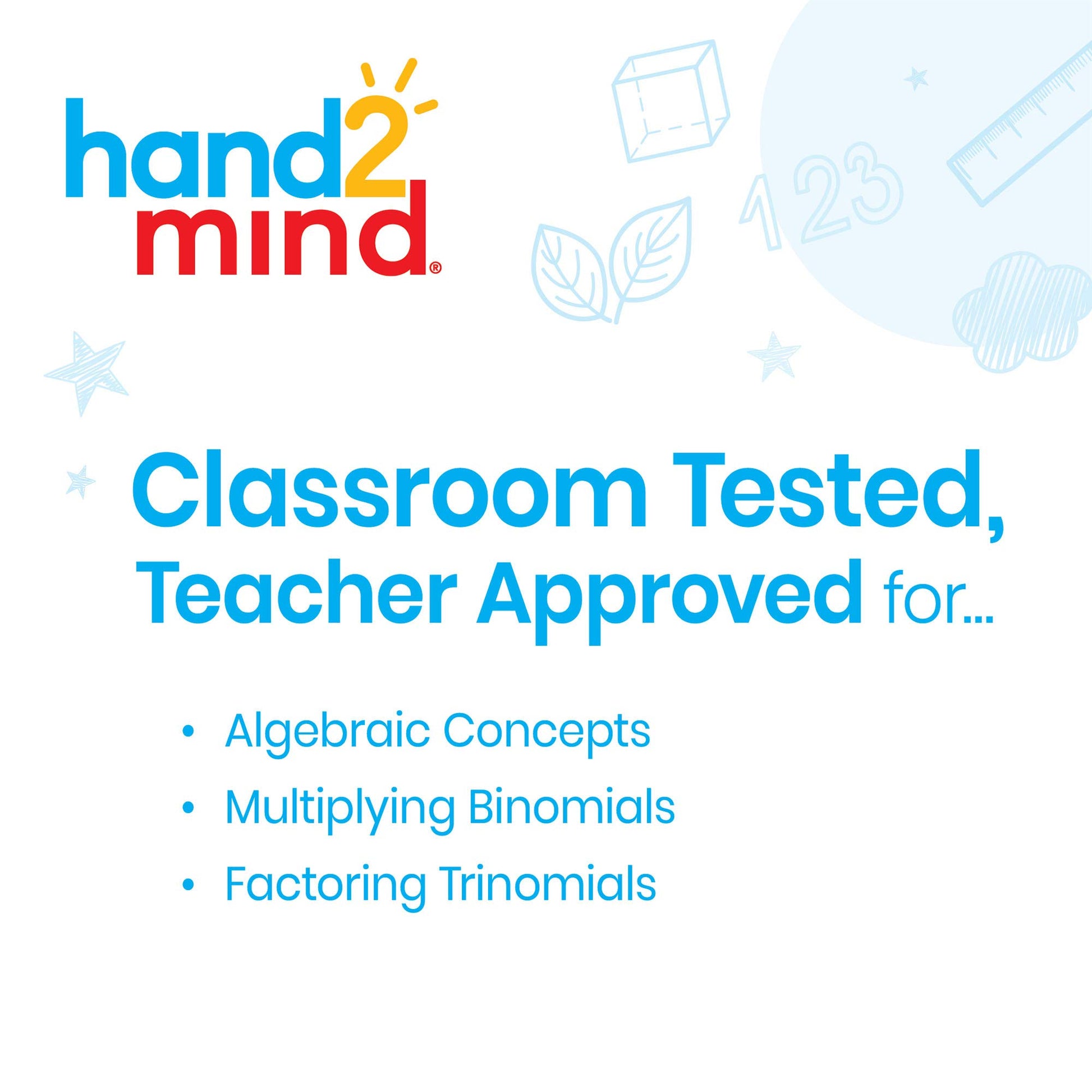 Algebra tiles are one-dimensional square and rectangle manipulatives that represent different variables of x. Students will learn algebraic concepts, add and subtract Polynomials, factor trinomials, and apply the zero principles. Tiles are used as an Algebra resource at any age. Includes: 30 sets of plastic algebra tiles, versatote, and free algebra tiles virtual manipulative subscription. For over 50 years, hand2mind has encouraged hands-on learning and discovery, driving deeper understanding and helping children unlock their full potential. With products designed to enhance learning in the classroom and the world around us, we strive to find new ways to encourage hands-on exploration and discovery.
