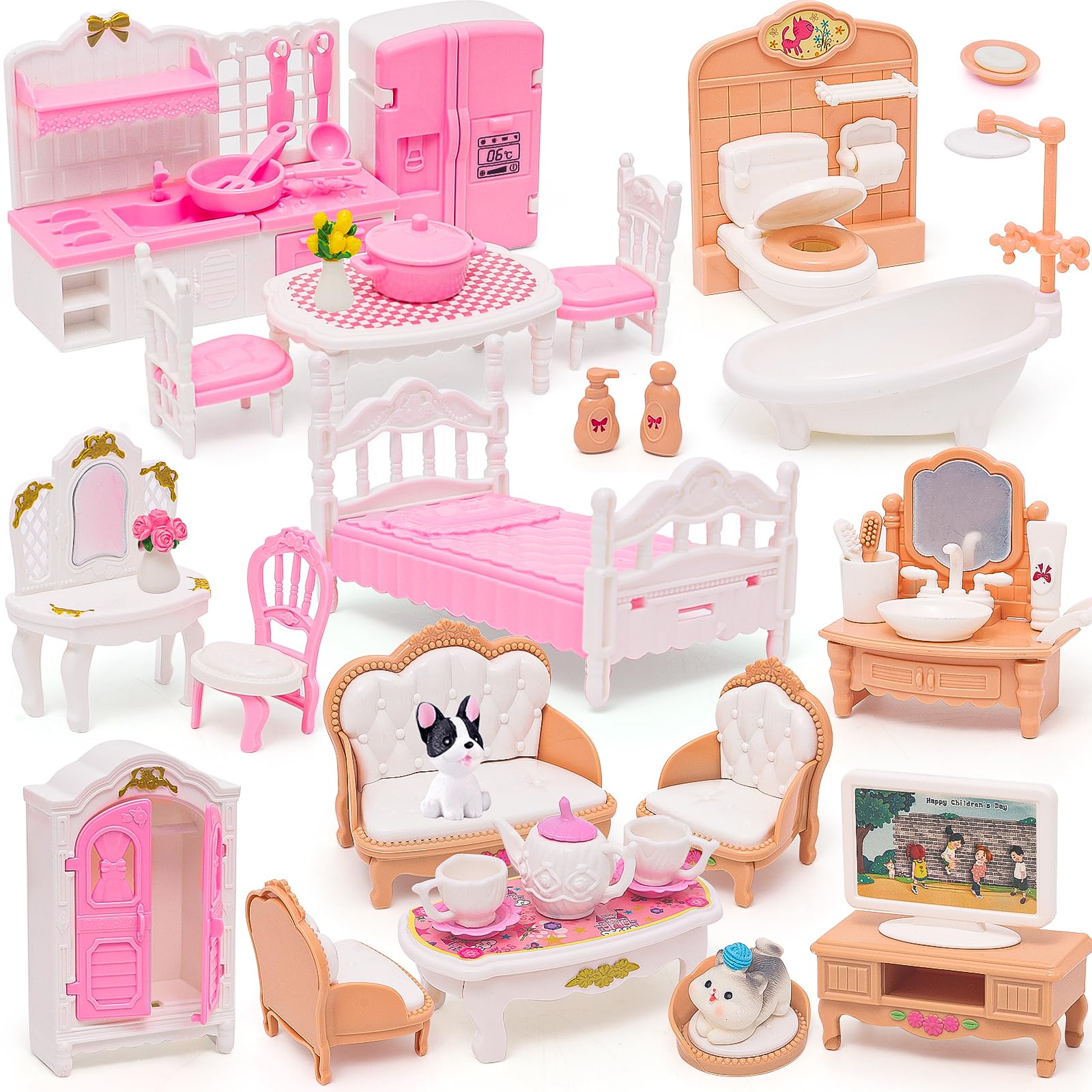 - Q: What types of furniture are included in the set? A: This comprehensive dollhouse furniture set includes a variety of pieces for different rooms: a bathroom with a toilet, bathtub, and washbasin; a bedroom with a dressing table, wardrobe, chair, and bed; a living room with a sofa set, table, cushion, TV stand, and tea set; and a kitchen with a dining set, cooker set, hob, sink, fridge, and dining table with chairs.