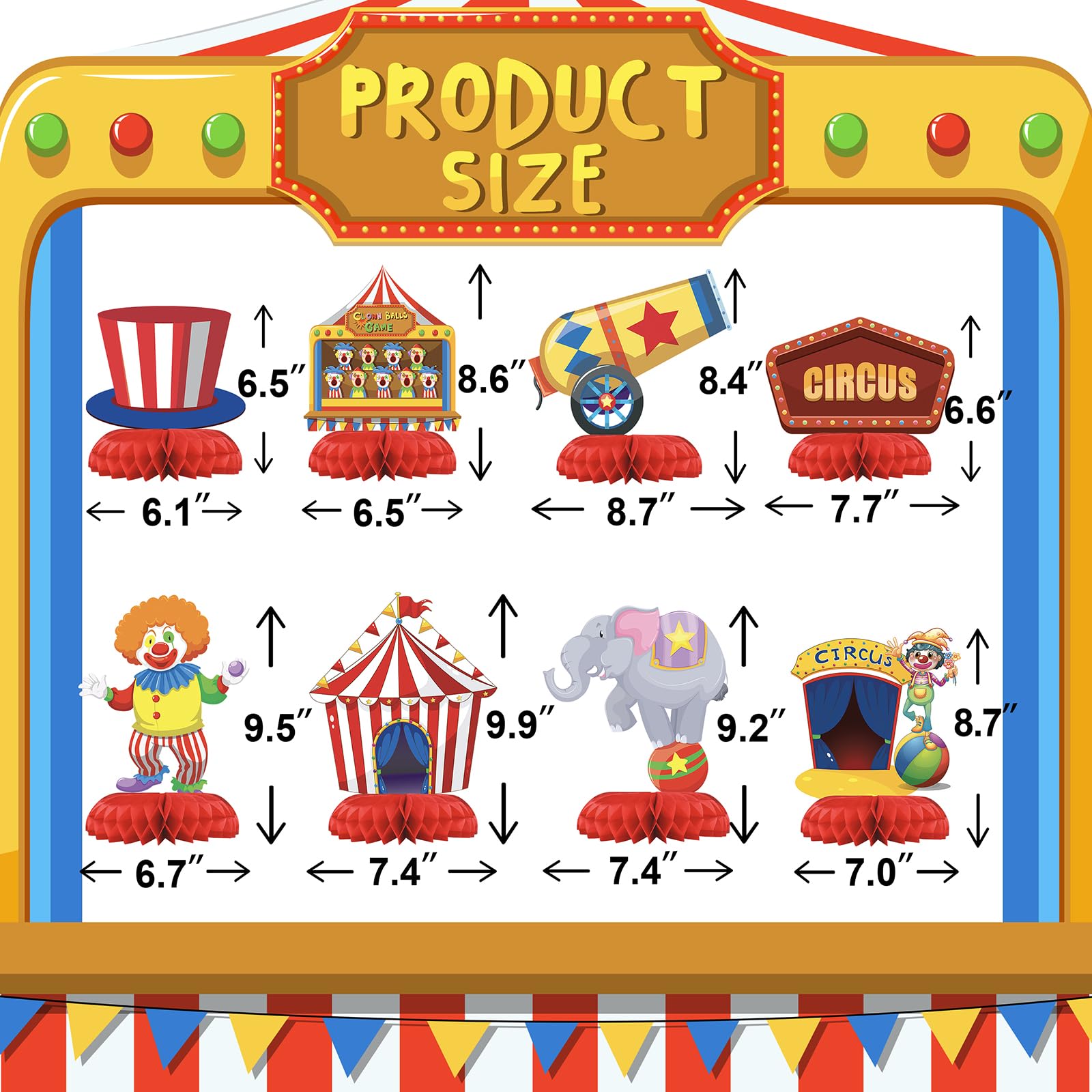 - Q: How many centerpieces are included in a set? A: Each set includes 8 adorable Watercolor Circus Honeycomb Centerpieces, perfect for enhancing your circus-themed events.
