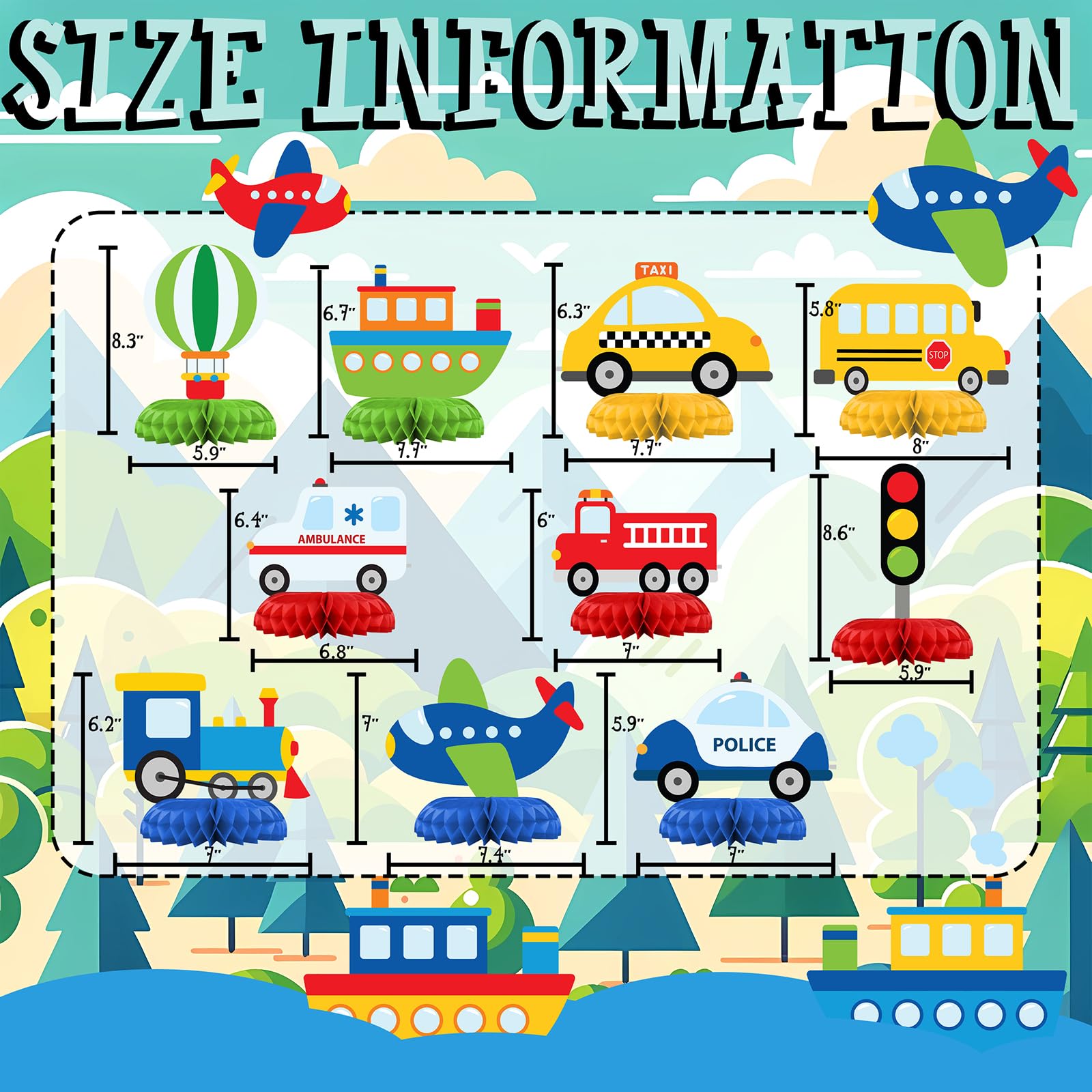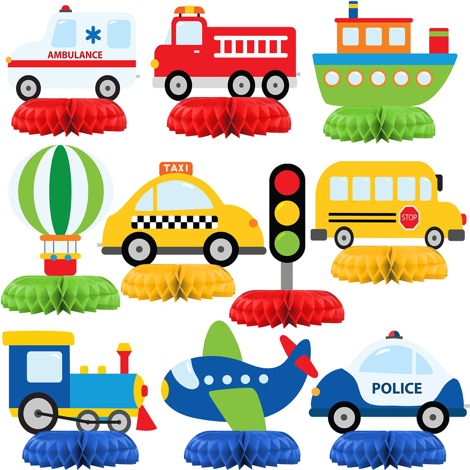 - Q: How many centerpieces are included in the set? A: The set includes 10 adorable Transportation Honeycomb Centerpieces, allowing you to create a vibrant and cohesive decoration theme for your event.