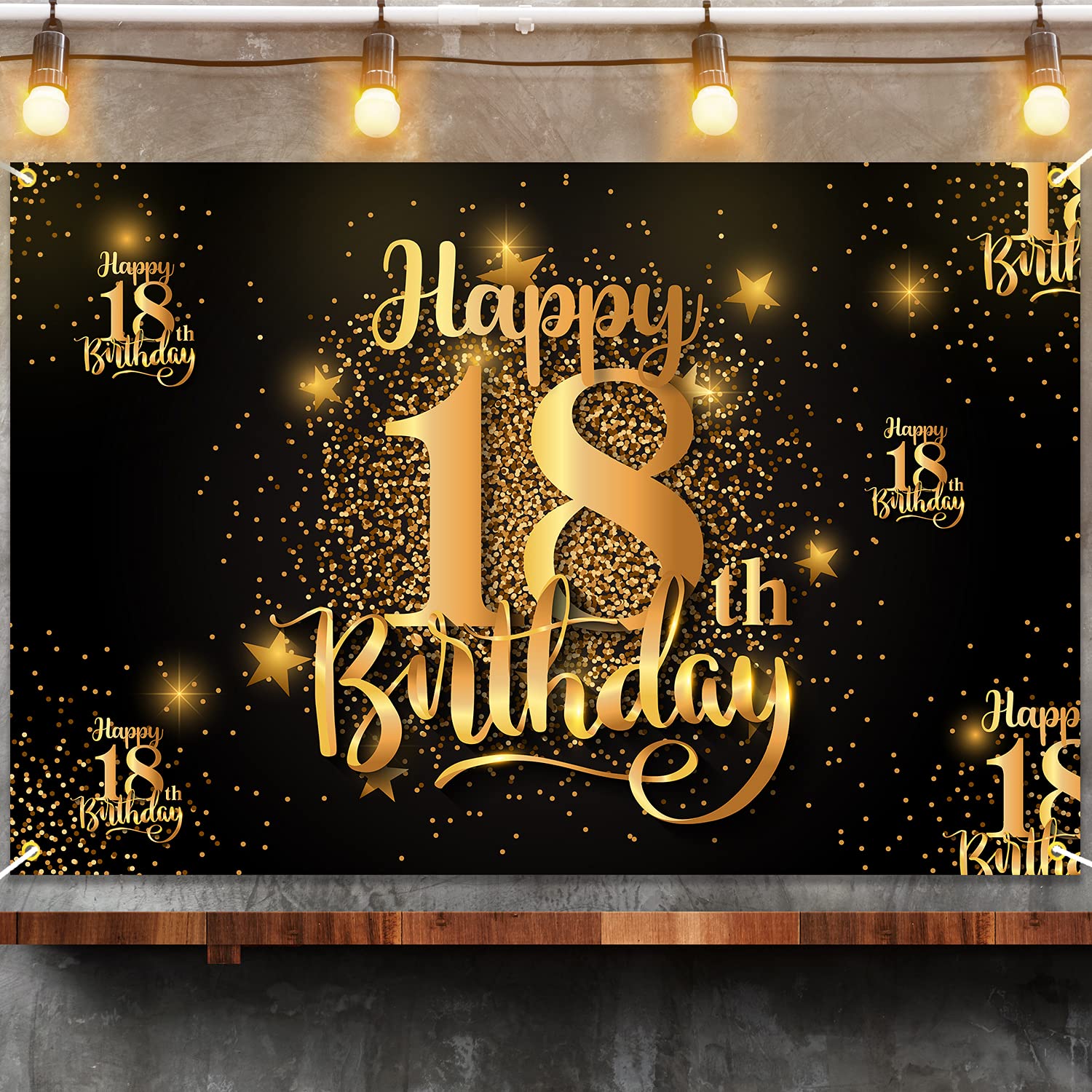 Happy 18Th Birthday Backdrop Banner Step And Repeat 18 Years Old Background Decorations For Women Men Her Him Photography Party Supplies Glitter Black Gold