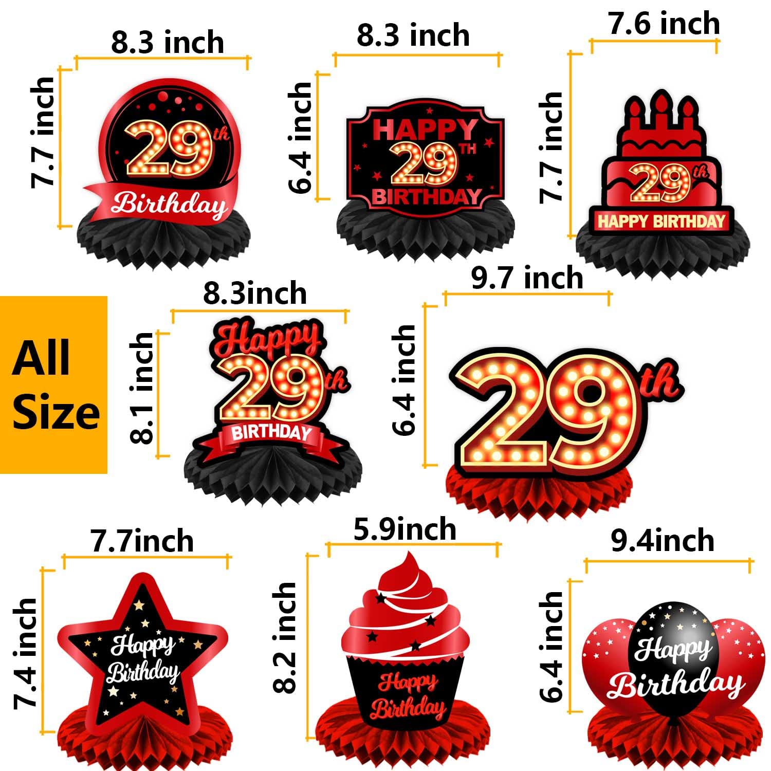 - Q: What are the dimensions of the birthday centerpieces? A: Each honeycomb centerpiece measures approximately 5.5 x 5.9 inches, making them the perfect size to add a vibrant touch to your table decor without overwhelming the space.