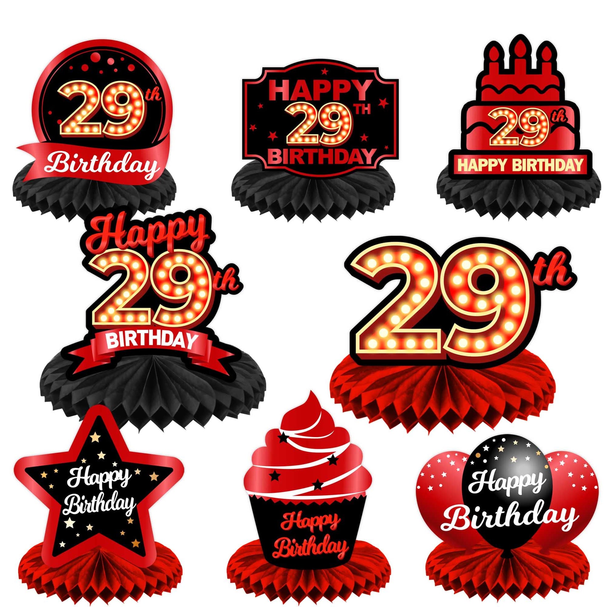 Happy 29Th Birthday Red And Black Table Honeycomb Centerpieces Balloons Theme Decor Table Decorations Table Toppers For Girls Women Princess 29 Years Old Birthday Party Bday Supplies Background Gold