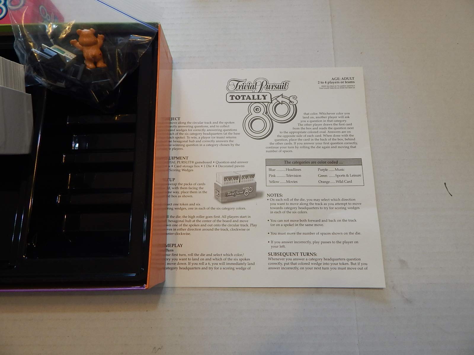 - Q: How should I care for the components of the Trivial Pursuit: Totally 80s game? A: To maintain the quality of the game, keep it in a dry place away from direct sunlight and handle the tokens and cards gently. Avoid exposing the game to moisture to prevent damage.
