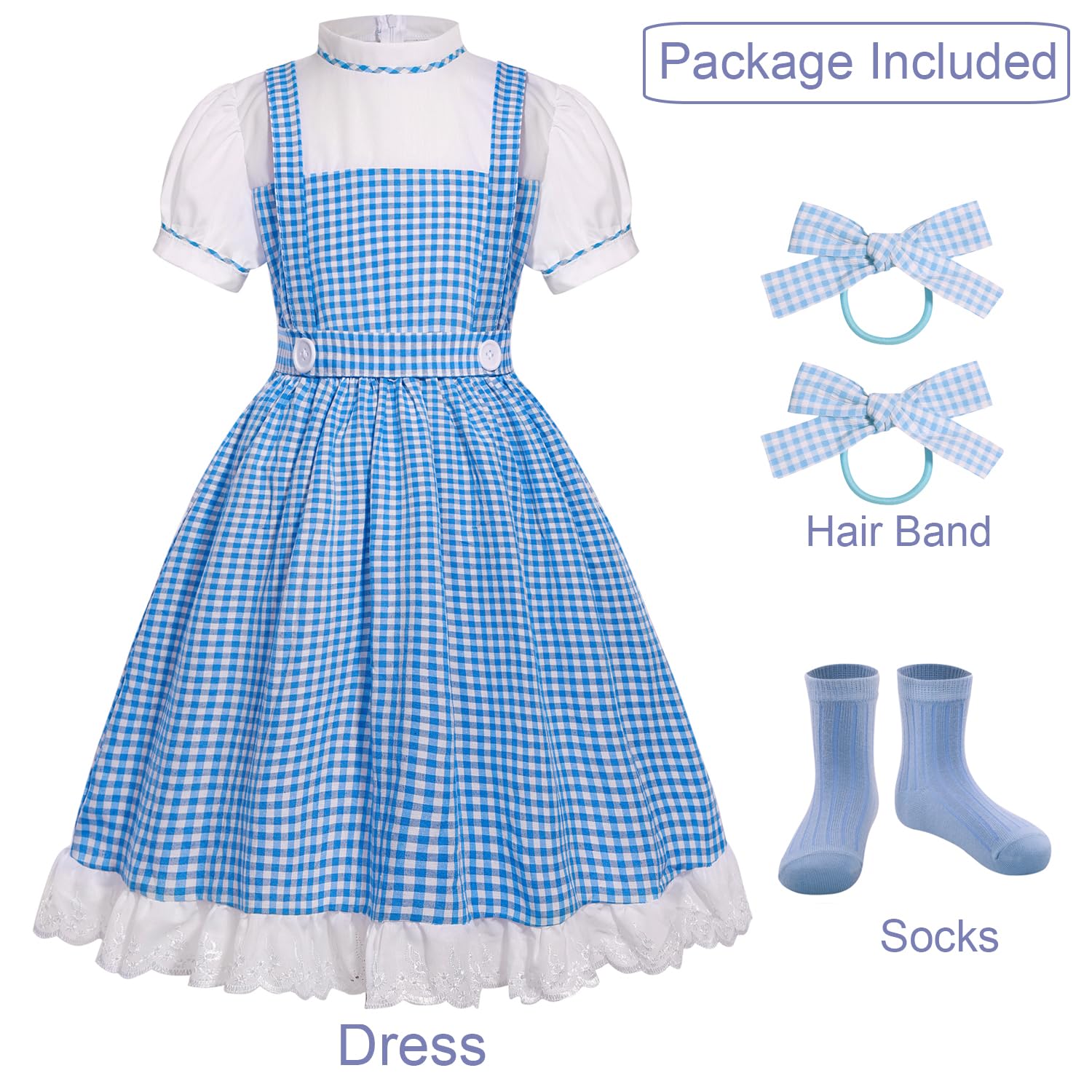 Halloween Princess Costume For Girls Included:1* Girls Blue Gingham Dress, 1 Pair Hair Ties, 1 Pair Blue Socks, Perfect For Princess Costume Role Cosplay