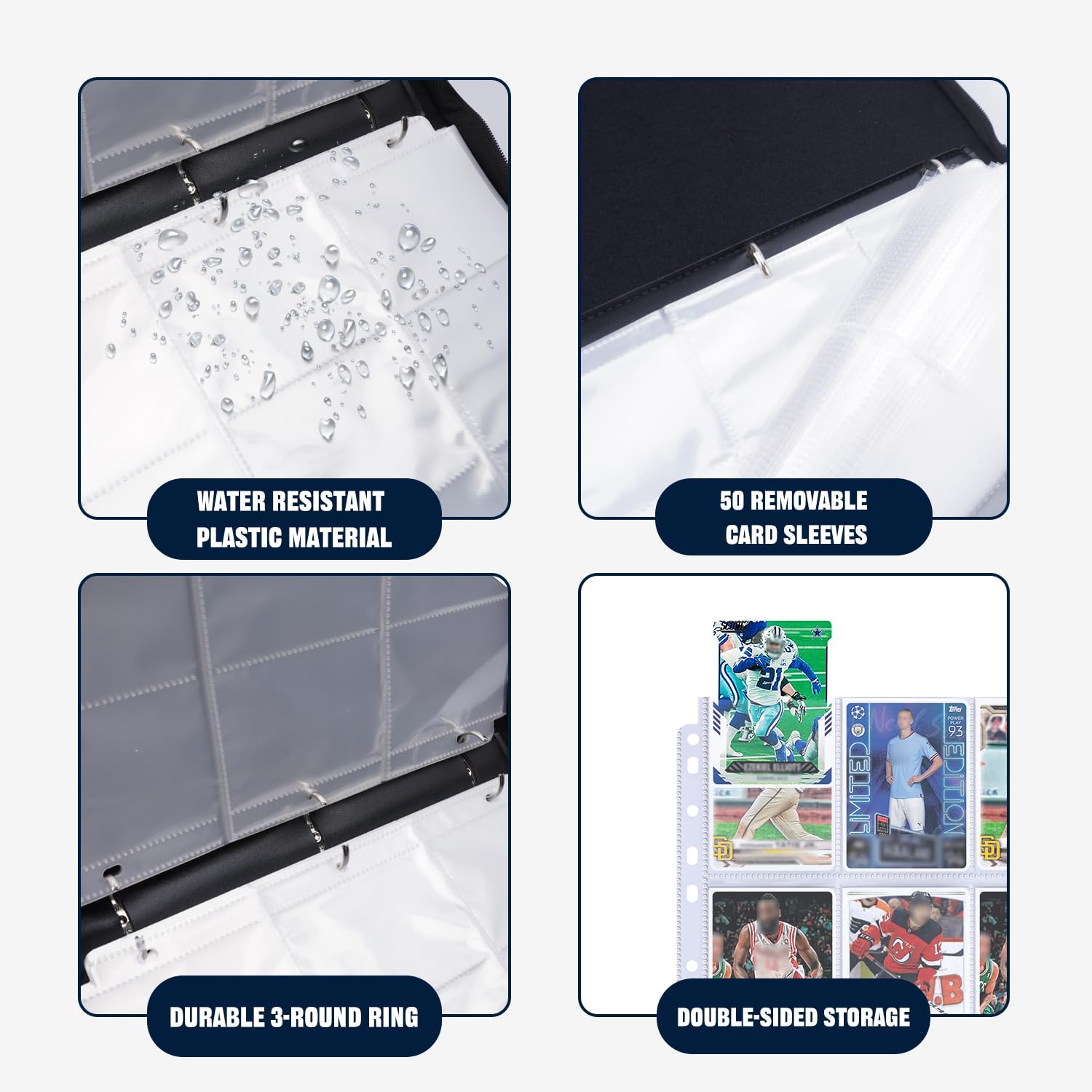 ?Perfect Fit?The size of the internal card slot of the trading card binder is 3.6 * 2.8 inches; This card binder fits all standard-size cards like football cards baseball cards basketball cards top aces game cards attack cards TCG MTG and more. (Albums Only!) ?enhanced Fabric?This card binder is made of enhanced PU leather durable and waterproof. Highly transparent card holder for easy display and navigation. Zipper design ensures cards will not be lost. Provide full protection for your cards. ?Large Capacity?The 9-pocket card binder with 50-page sleeve can hold 900 cards. Store and display your cards in this trading card binder to keep them organized; The sturdy 3 metal D-rings inside the card storage bag securely hold 50+ removable 9-pocket sheets that can be easily added or removed when necessary. ?Portable Card Holder?The extra wristband design makes the card binder easy to carry to your friend's house or travel. You can show your cherished cards to your friends anytime anywhere and enjoy collecting them together. ?Best Gift ?The iconic graphic design of the sports card binder is loved by other collectors. This is an ideal gift for card collectors children and friends; Compatible with Multiple Standard Cards or Game Cards.