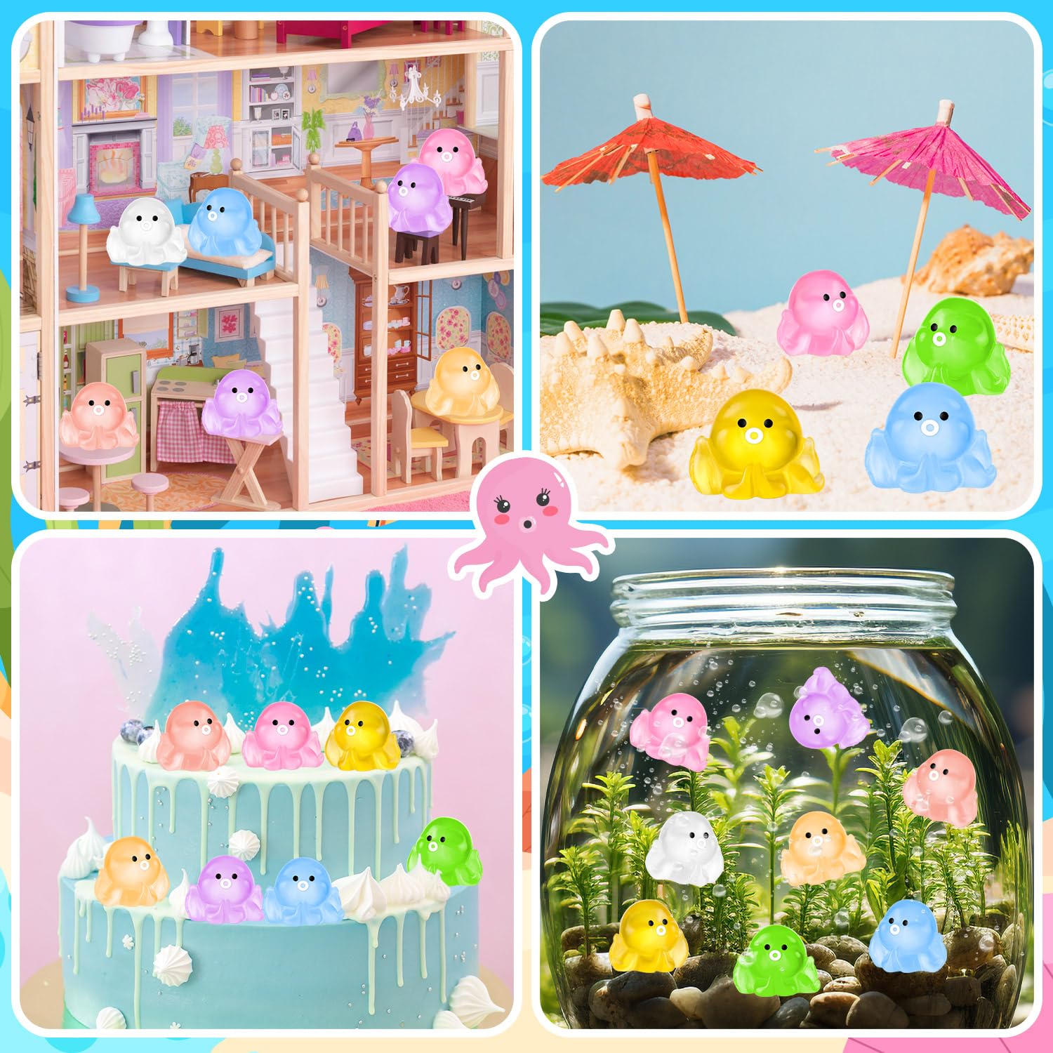 SUFFICIENT QUANTITY: The package contains a total of 96 mini resin octopus in 8 different colors, enough to meet your decorative needs | HIGH QUALITY MATERIAL: These luminous octopus are made of high quality resin. The are durable and sturdy, and can withstand frequent handling and wear and tear | WIDE APPLICATION: These glow in the dark resin octopus can not only decorate your miniature garden landscape, fish tank, aquarium, plants, cakes. You can also use them to make some DIY crafts or use them as school activity rewards. | LUMINOUS DESIGN: The min Octopus are made of luminous design, which can glow in the dark. Please note that the tiny octopus needs to be placed in the sun to absorb light in order to glow in the dark | IDEAL PRESENT OPTION: You can give miniature octopusto your friends and family as birthday party, holiday You can also DIY beautiful mini jewelry with your friends and enjoy the fun of crafting
