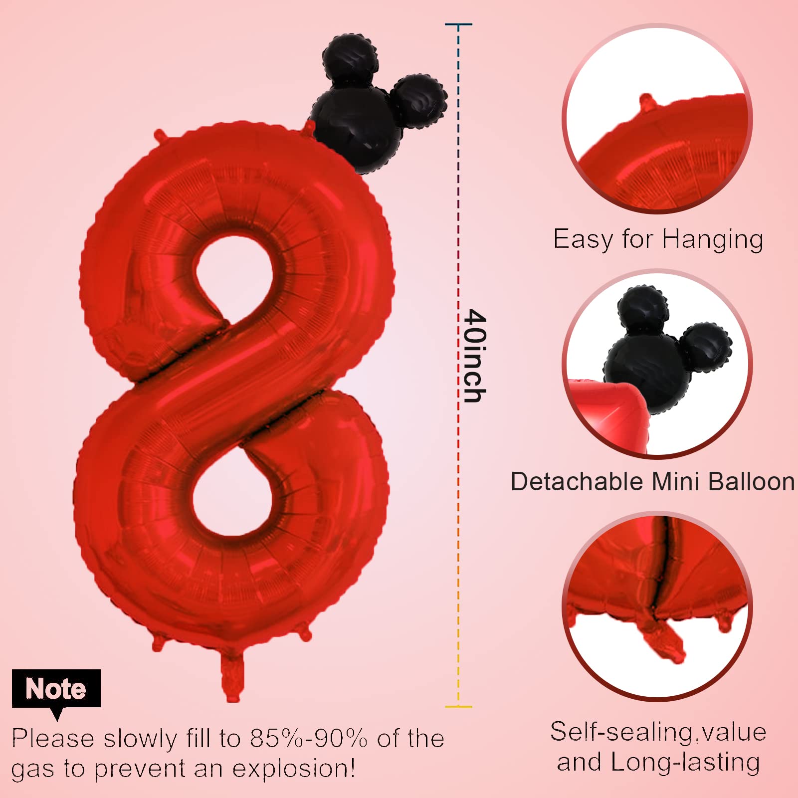 Hibilder 2Pcs Set, Red Number 8 & Mini Mouse Head Balloon, 40Inch, Aluminum, Novelty Pair, Birthday, Baby Shower, Anniversary, U