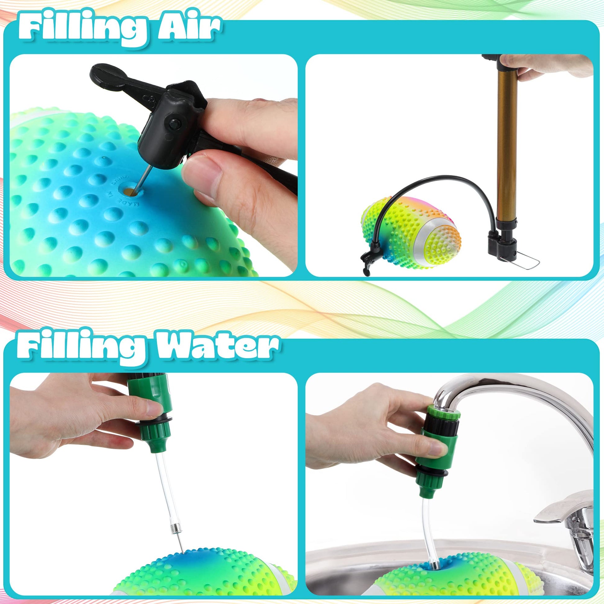 Specification: Color: colorful Material: PVC Size: 9.6 inches Package includes: 1 x Swimming pool underwater football 1 x Hose adapter with filling needle Warm tip: 1. Suitable for people over 12 years old. 2. Please allow a little error on the size due to manual measurement. Please allow slight color differences due to different monitors and light effects. 3. Do not adjust the water volume to the maximum when filling water. 4. After fulfilled, please remove the water filling needle in time and keep it in a safe place to avoid contact with the elderly and children.