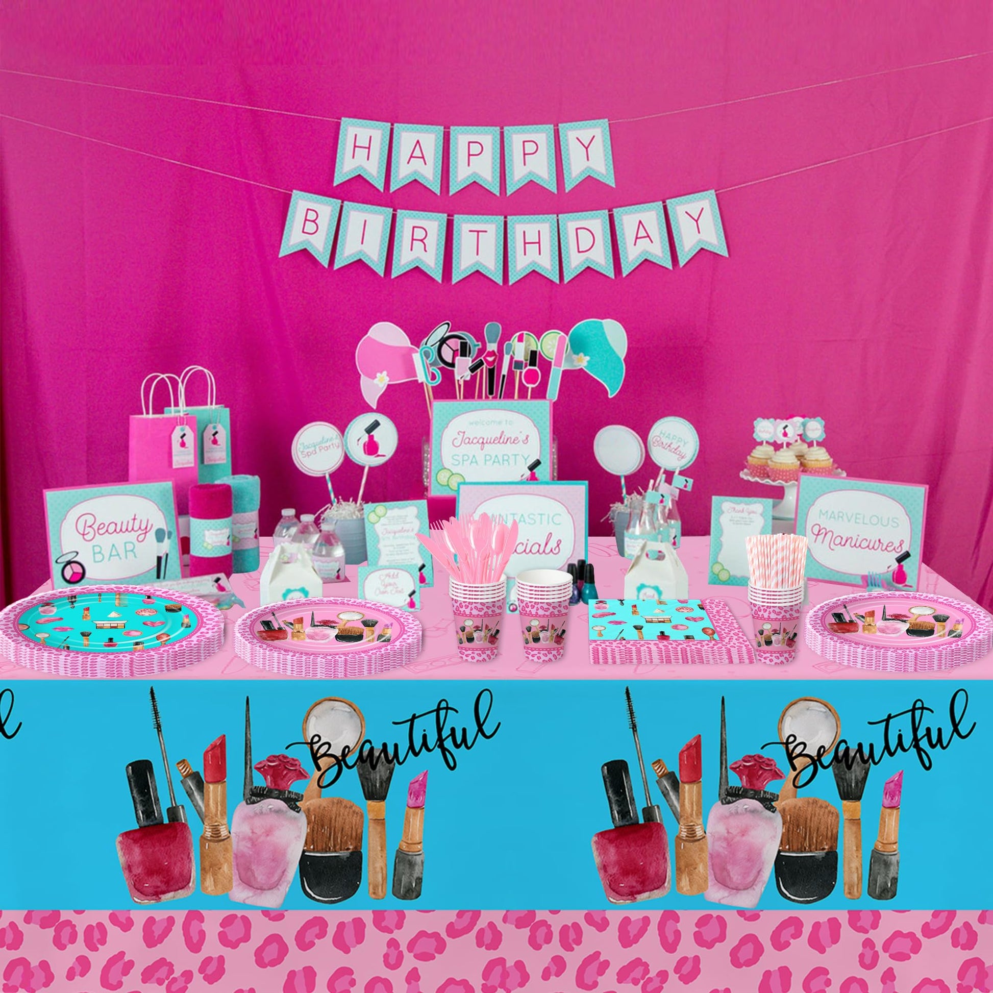 Makeup Theme Spa Plates and Napkins Party Supplies Tableware Kit Includes: 24 Pcsx Disposable Forks Set 24 Pcs x 9 Spa Paper Plates 24 Pcs x 7 Makeup Party Plates 24 Pcs x Party Napkins 2 Pcs x Makeup Table Cover This all-in-one makeup birthday party decorations set is an excellent purchase of party decorations for a birthday party