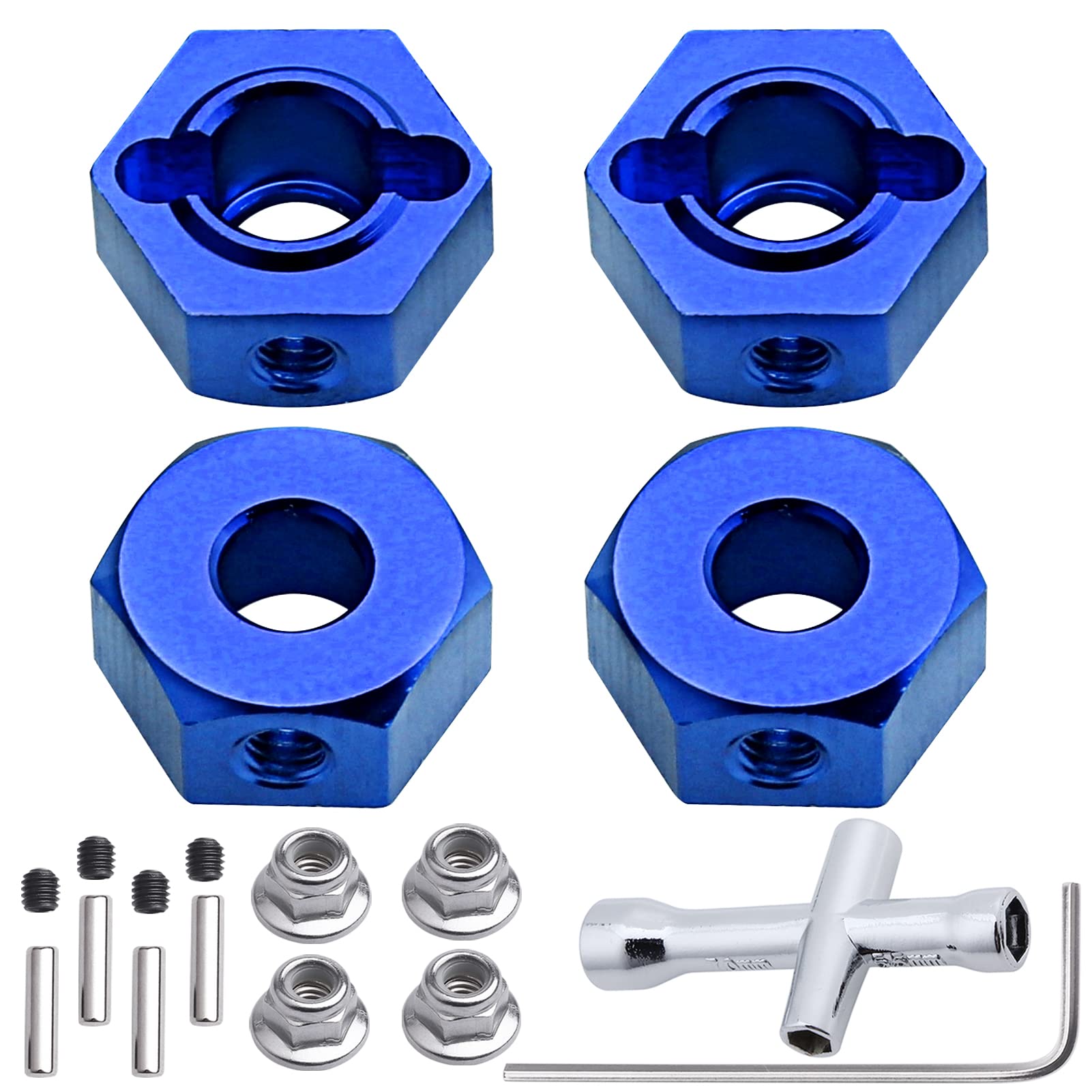 - Q: What does the package include when I purchase the wheel hubs? A: Each package includes four 12mm Wheel Hex Adapters, four Grub Screws, four Pins, four M4 Flanged Lock Nuts, a small cross hex wrench, and an L hex key, as shown in the product images.