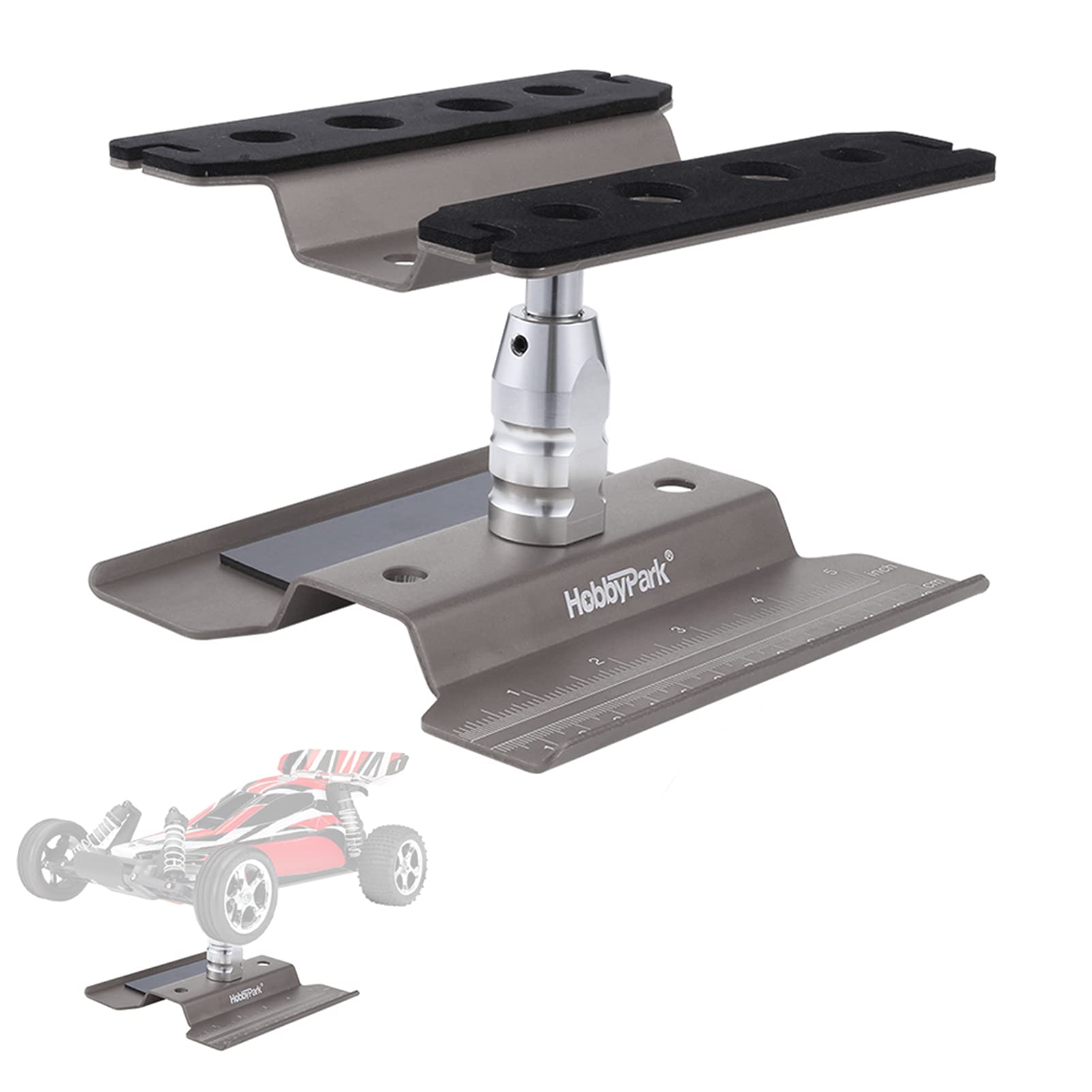 - Q: What RC car scales is the HobbyPark RC Car Work Stand compatible with? A: The HobbyPark RC Car Work Stand is compatible with a range of scales including 1:10, 1:12, 1:16, and 1:18. This versatility makes it suitable for various brands such as Traxxas, Redcat Racing, RC4WD, Axial, Tamiya, and WLtoys.