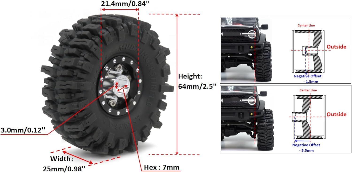 4pcs RC 1.0 Mud Slingers tires + Aluminum 1.0 Beadlock Wheels 7mm Hex Rim weight: 40g( 1pc tire with foam+1pc wheel) For 1:24 SCX24 1/18 TRX4M crawler Package List: 4pcs Adjustable Offset 1.0 Beadlock Wheels + 4pcs Soft sticky 1.0 Mud Slingers tires (This rc 1.0 wheel can be adjustable two offset: -1.5mm & -5.5mm Negative offset, meanwhile wheel with Stainless Steel Middle Ring to adds the perfect weight, Negative offset wheel and Heavy Duty middle ring added stability and help the RC mini crawler performance. ) Description 1. Adjustable two Offset: -1.5mm & -5.5mm ( -1.5mm offset: similar with original axial scx24 wheel offset; - 5.5mm offset: increased spacing between hubs for added stability. Put center part in shallow room offset is -1.5mm, in deep room offset is - 5.5mm ) 2. Made in the HOBBYSOUL Soft Sticky Compound tires + Aluminum Wheel with Stainless Steel Middle Ring ( Tire material better than common rubber,good heat resistance and good cold resistance, high wear resistance and excellent durability. ) 3. Tire diameter: about 64mm (2.5inch) 4. Tire Width: 25mm (0.98inch) 5. Wheel hex: 7mm 6. Weight : about 40g/pc ( 1pc tire with foam + 1pc wheel ) 7. Axle Through Hole Dia.: 3.0mm (0.118inch) Fit for 1:24 RC Crawler Axial SCX24 90081 AXI00001 or 1/18 TRX4M and other mini crawler.....