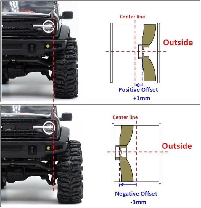 4pcs RC Brass Adjustable Offset 1.0 Beadlock Wheels Rims Micro Wheels Weight 44g/Rim, Negative offset RC 1.0 wheels ( -3mm negative offset wheels & +1mm Positive offset wheels ) For 1/18 Traxxas TRX4M 1/24 RC Crawler Car Axial SCX24 90081 AXI00001 Package List: 4pcs Adjustable Offset Brass 1.0 Beadlock Wheels (with screws) Description 1. Offset: - 3mm & +1mm ( +1mm offset: similar with original axial scx24 wheel offset; - 3mm offset: increased spacing between hubs for added stability. Put center part in shallow room offset is +1mm, in deep room offset is - 3mm ) 2. Material: Brass 3. Wheel diameter: 27.5mm (1.08inch) 4. Wheel Width: 16mm (0.63inch) 5. Wheel hex: 7mm 6. Weight: about 44g/rim ( perfect weight and help the mini crawler performance.) 7. Axle Through Hole Dia.: 3.0mm (0.118inch)