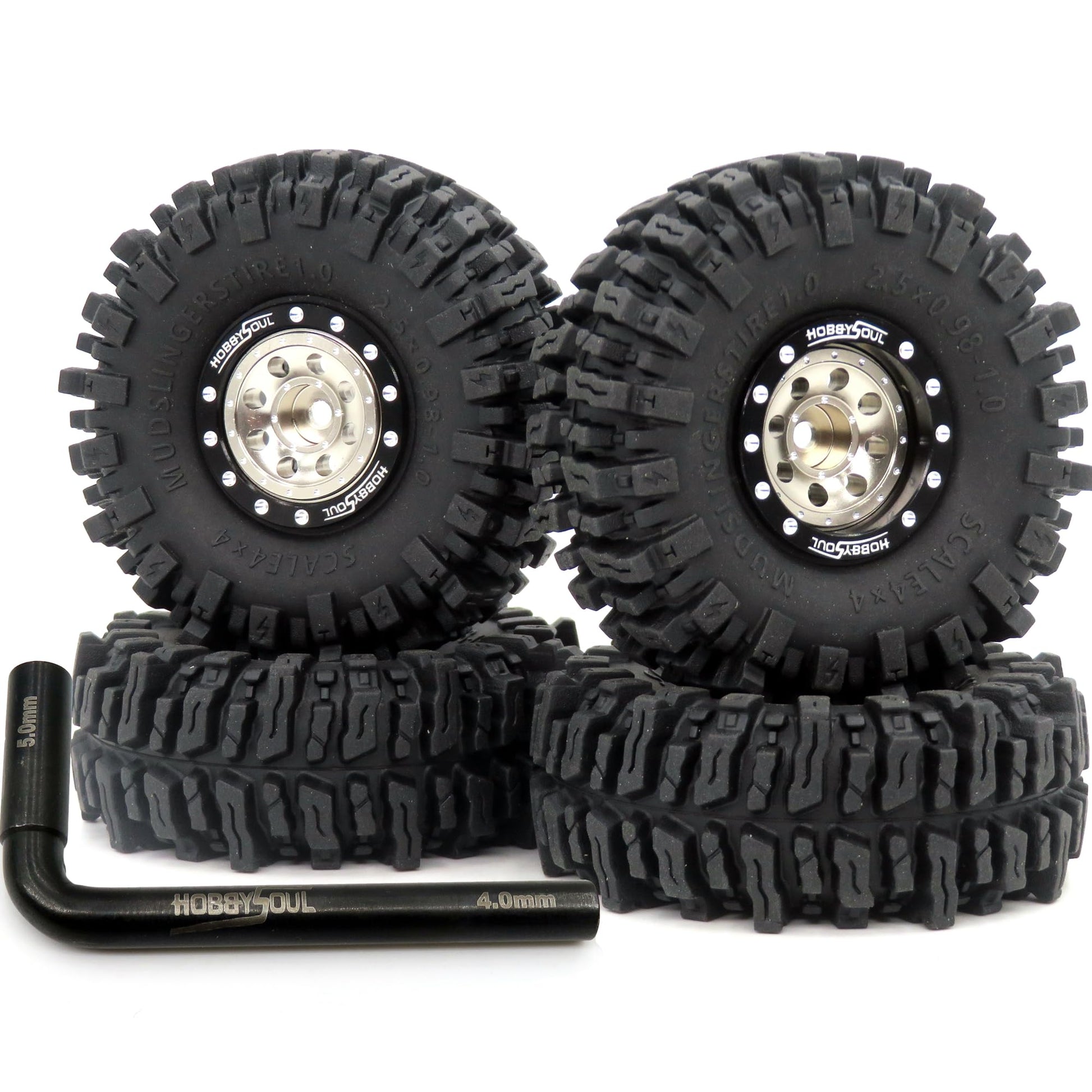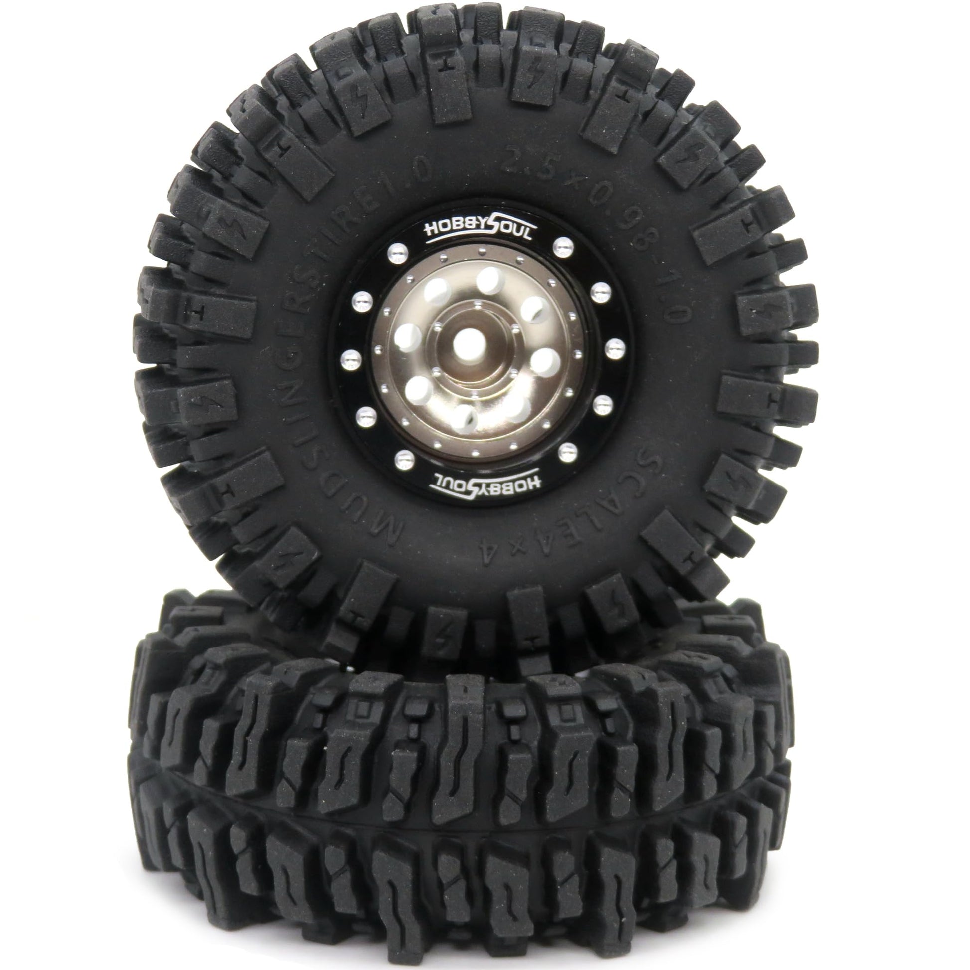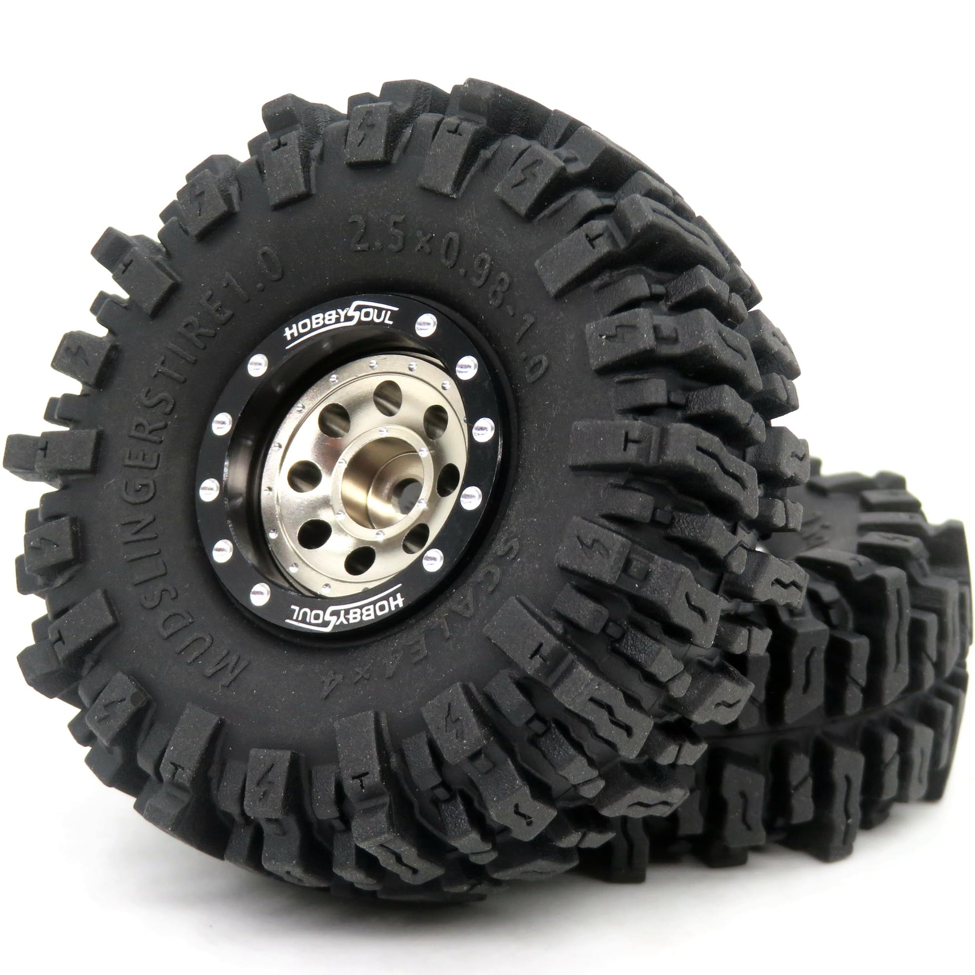 HOBBYSOUL RC 64 * 25mm 1.0 Mud Slingers Tires Soft Sticky Tyres & Heavy 1.0 beadlock Wheels Adjustable Offset Rims for RC Rock C