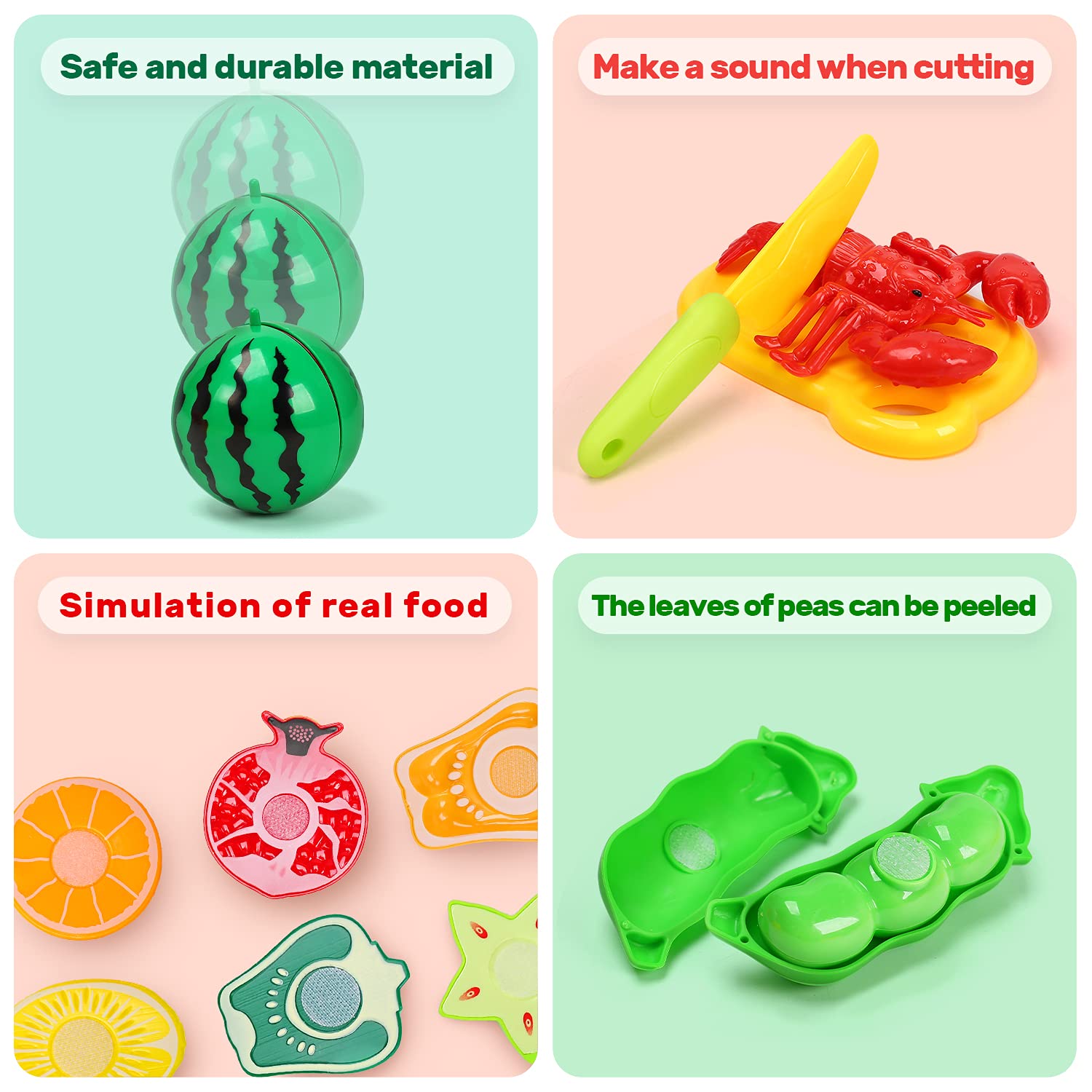 - Q: How can this play food set enhance my child's learning? A: This play food set encourages imagination and creativity in children. It helps develop their hands-on abilities, teaches them about different types of food, and enhances their color recognition and sorting skills during pretend play.