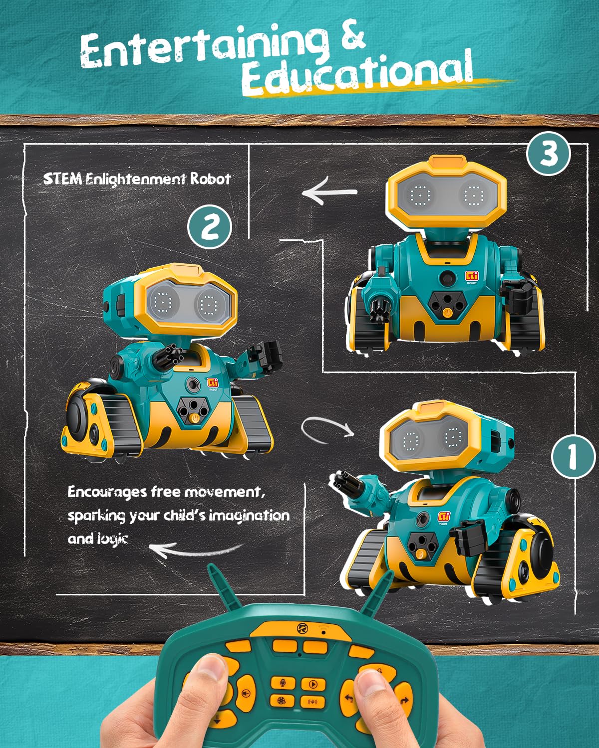 • Q: How does the remote control work with the robot? A: The remote control is user-friendly, allowing kids to easily make the robot move, dance, and perform custom actions. It encourages imaginative play and logical thinking.